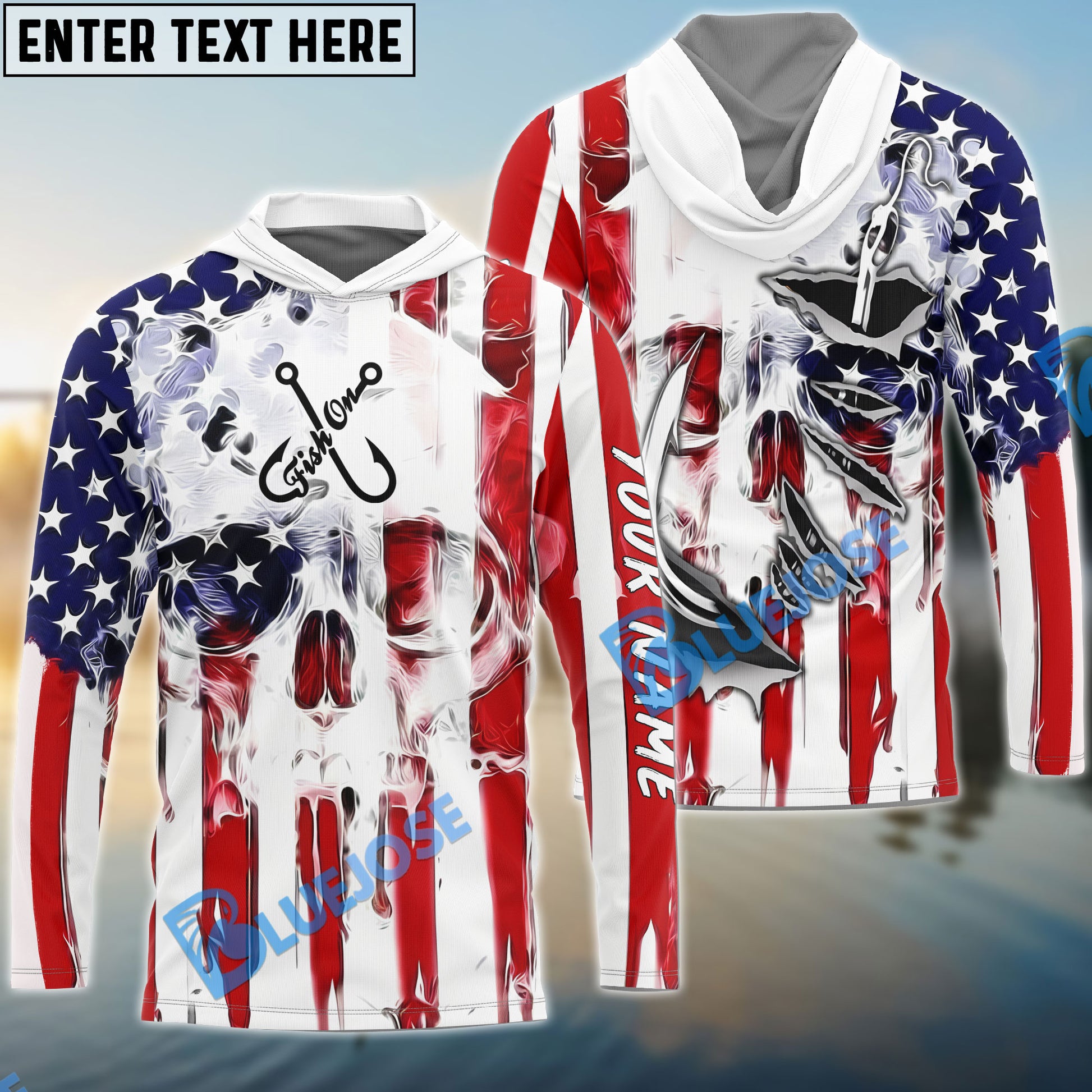 Bluejose American Flag Skull Fish Hook Long Sleeve Fishing Shirts, Personalized Patriotic Fishing Gifts