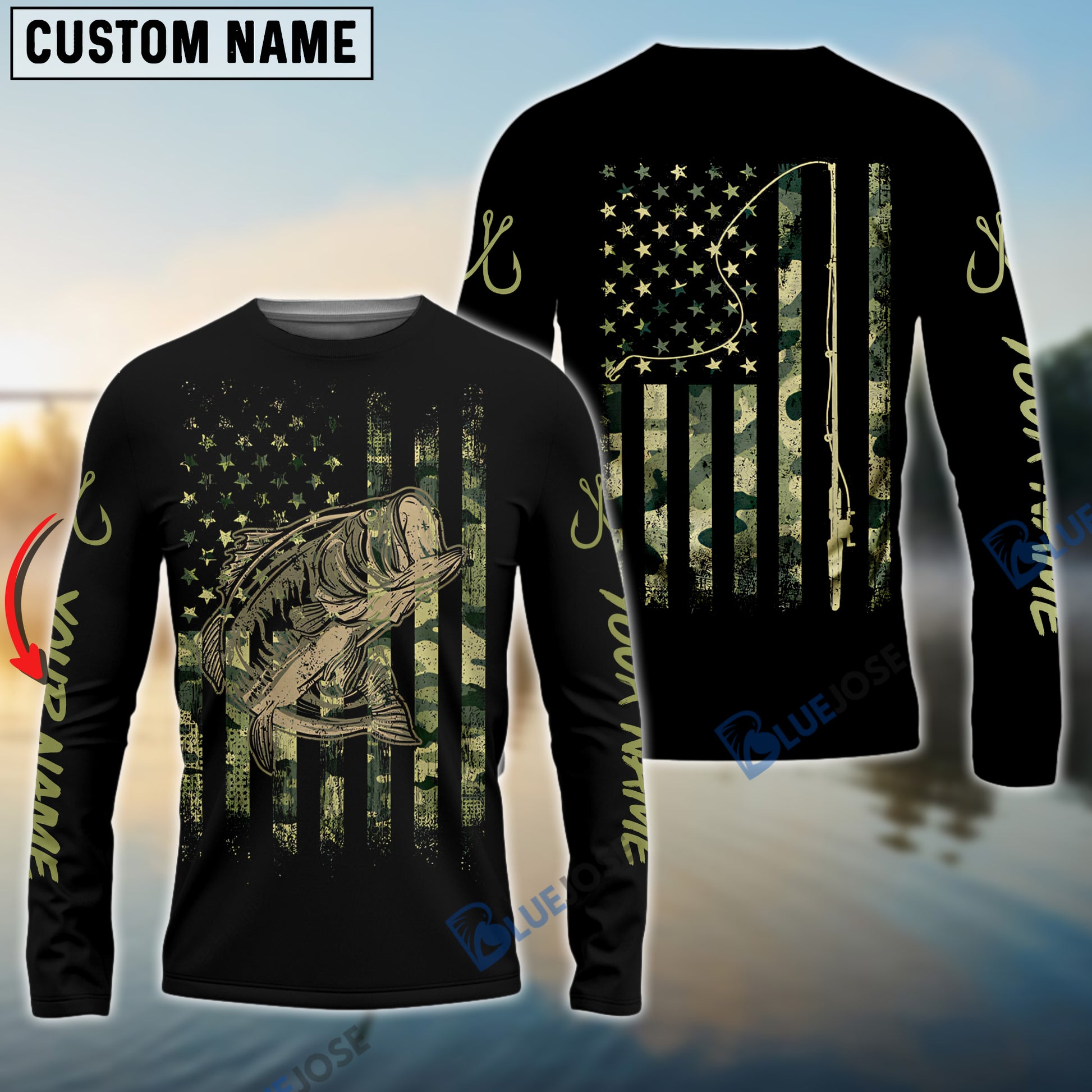 Bluejose Bass Fishing Camo American Flag Custom Long Sleeve Fishing Shirts , Personalized Patriotic Fishing Gifts
