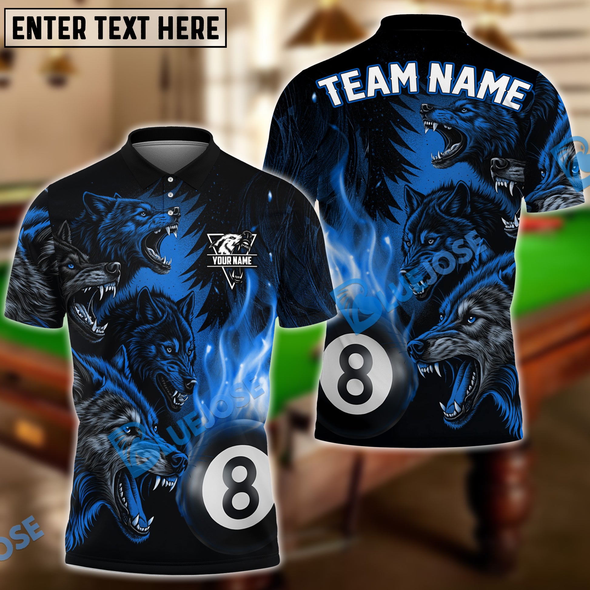 BlueJose Billiards 8-Ball Fire Wolfpack Personalized Name Shirt (4 Colors)