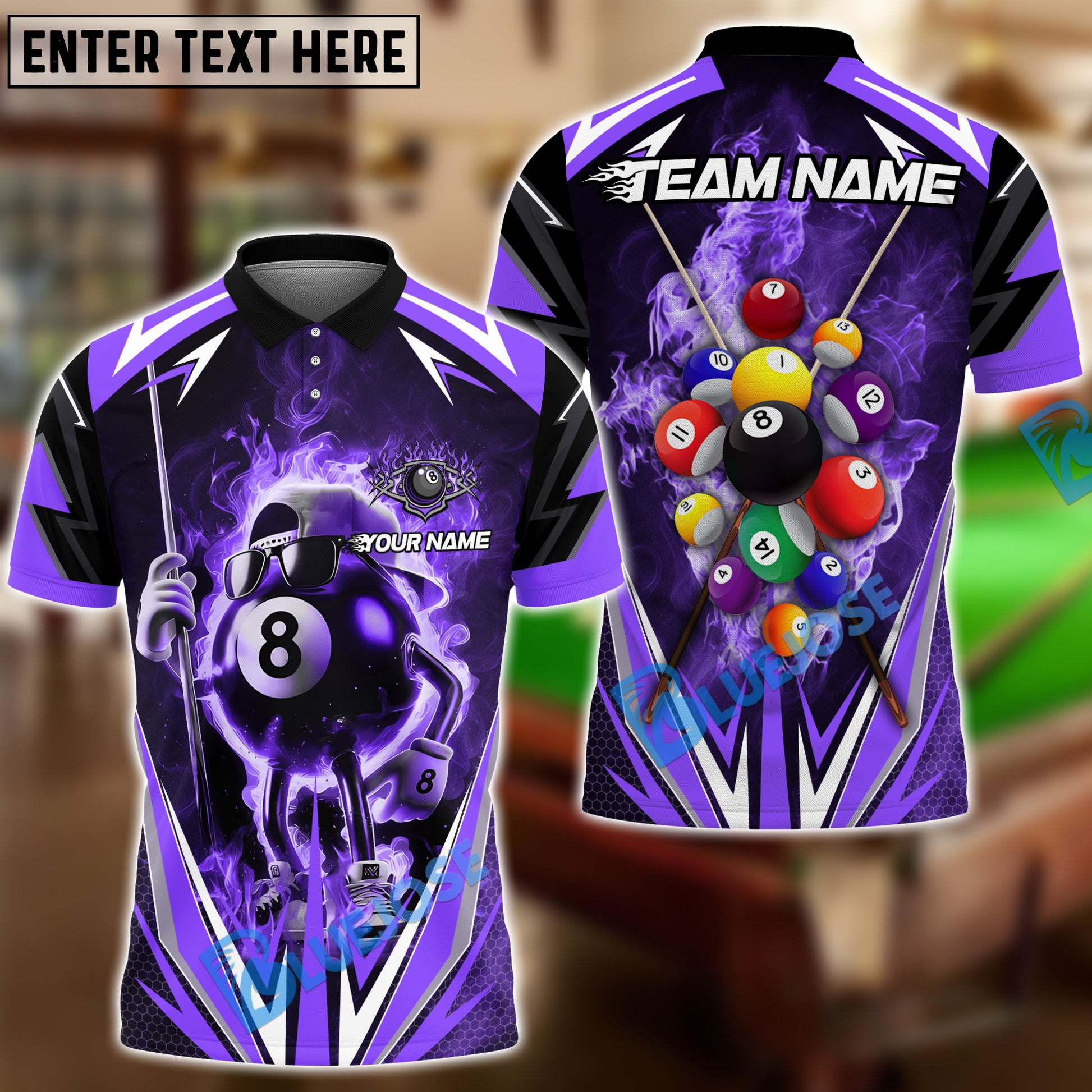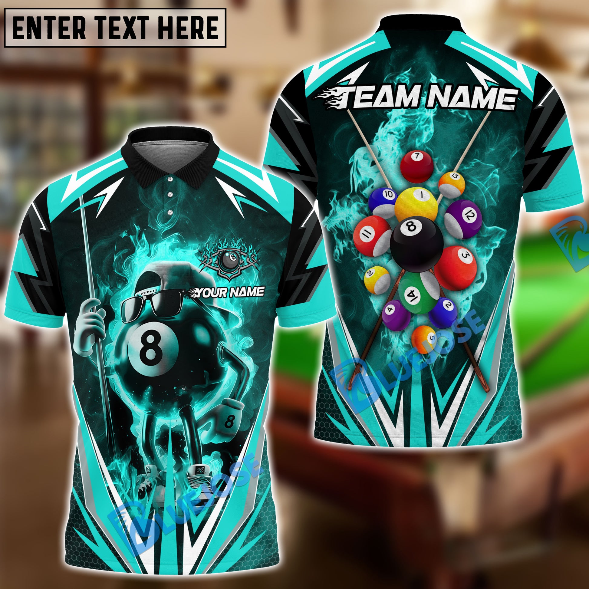 BlueJose Billiards 8 Ball Flame Cartoon Personalized Name, Team Name Unisex Shirt (4 Colors)