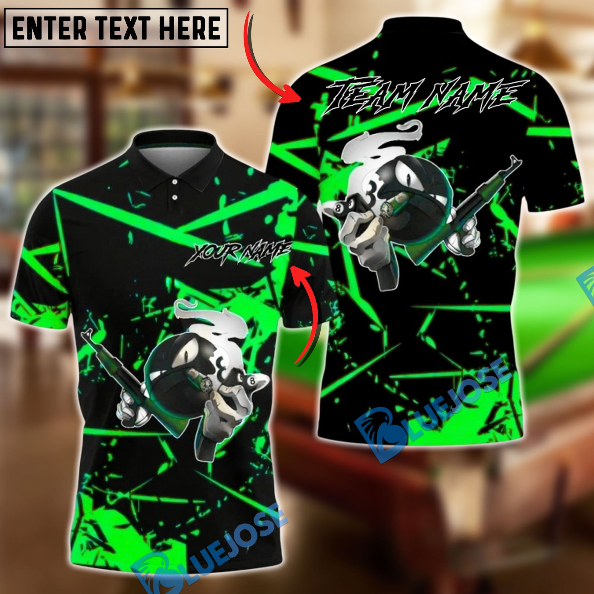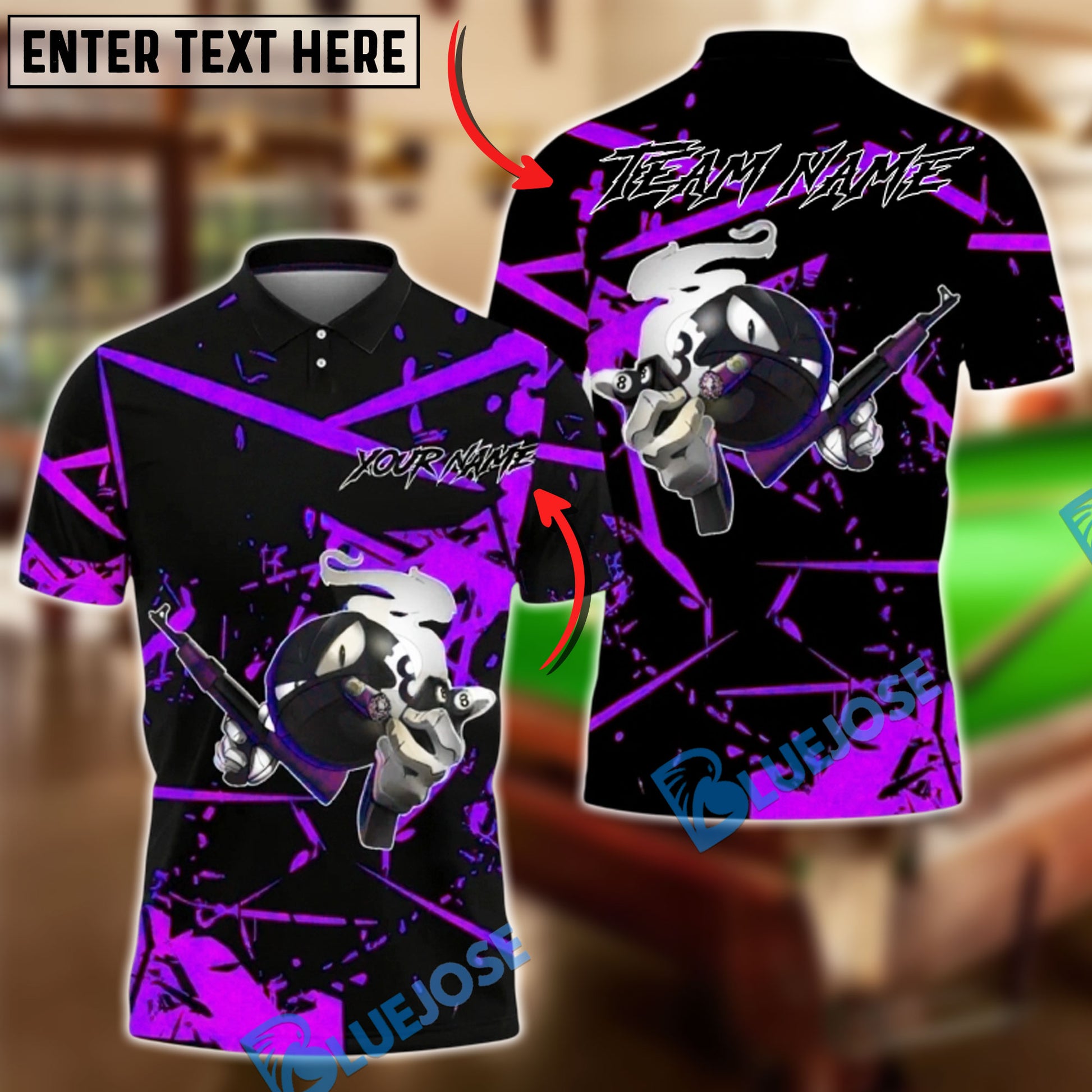 BlueJose Billiards 8 Ball Gangster with Rifle Personalized Name, Team Name Unisex Shirt (4 Colors)