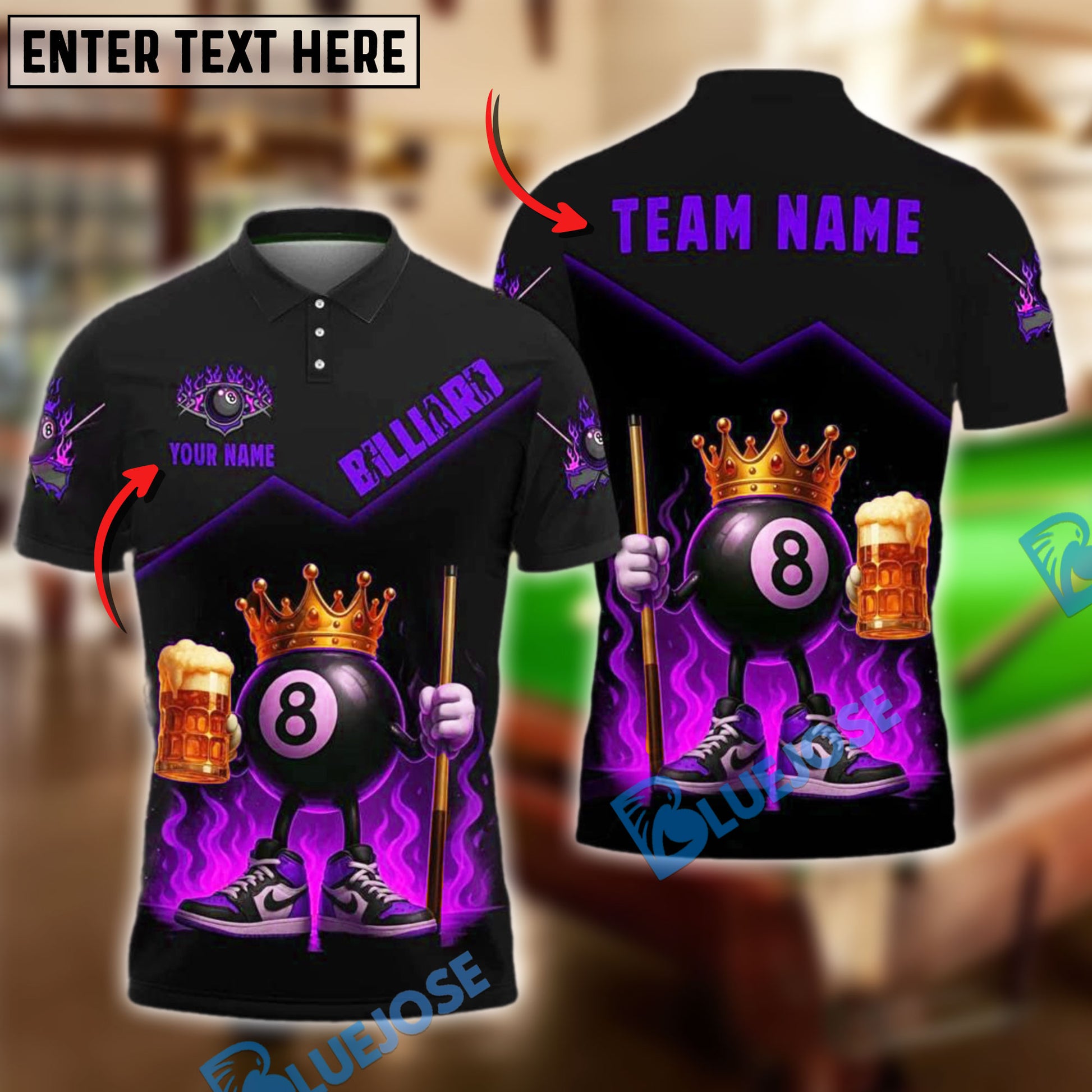 BlueJose Billiards 8 Ball King Fire Beer Style Personalized Name & Team Name Shirt (4 Colors)