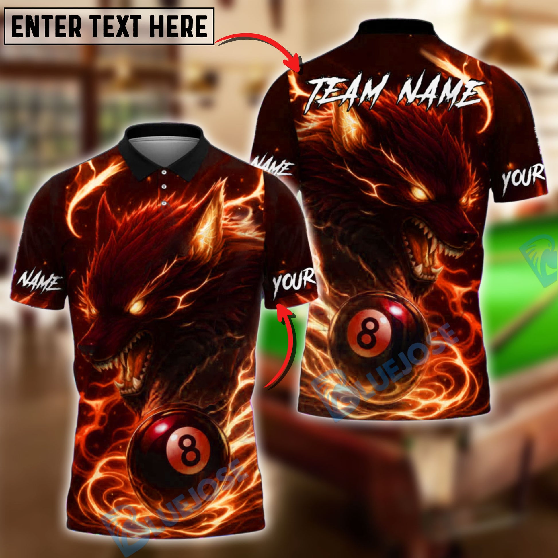 BlueJose Billiards 8 Ball Lightning Wolf Personalized Name, Team Name Unisex Shirt (4 Colors)