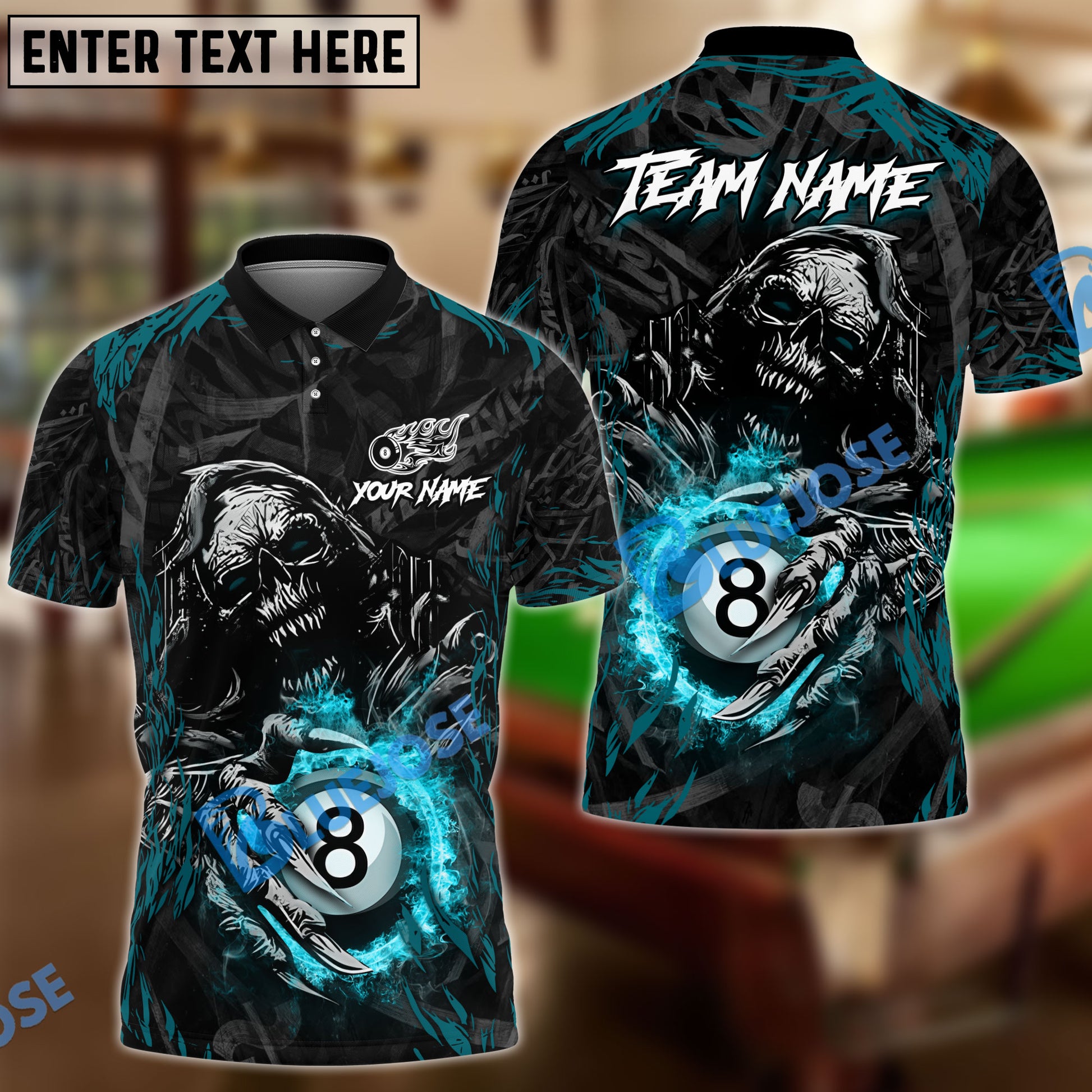 BlueJose Billiards 8 Ball Pool Skull Fire Claws Personalized Name Shirt (4 Colors)