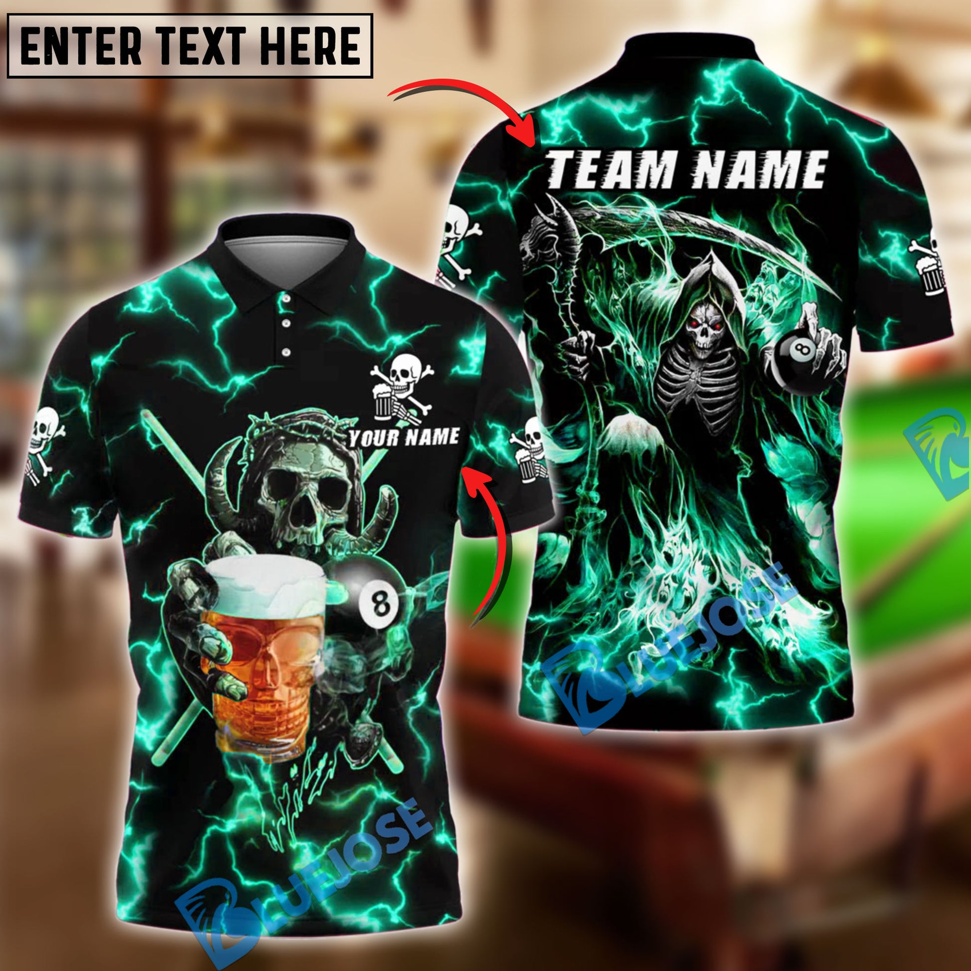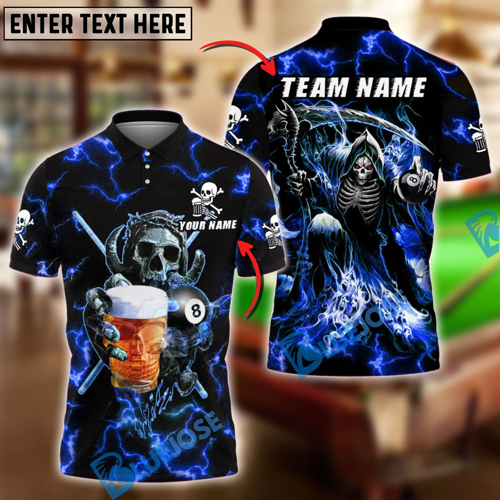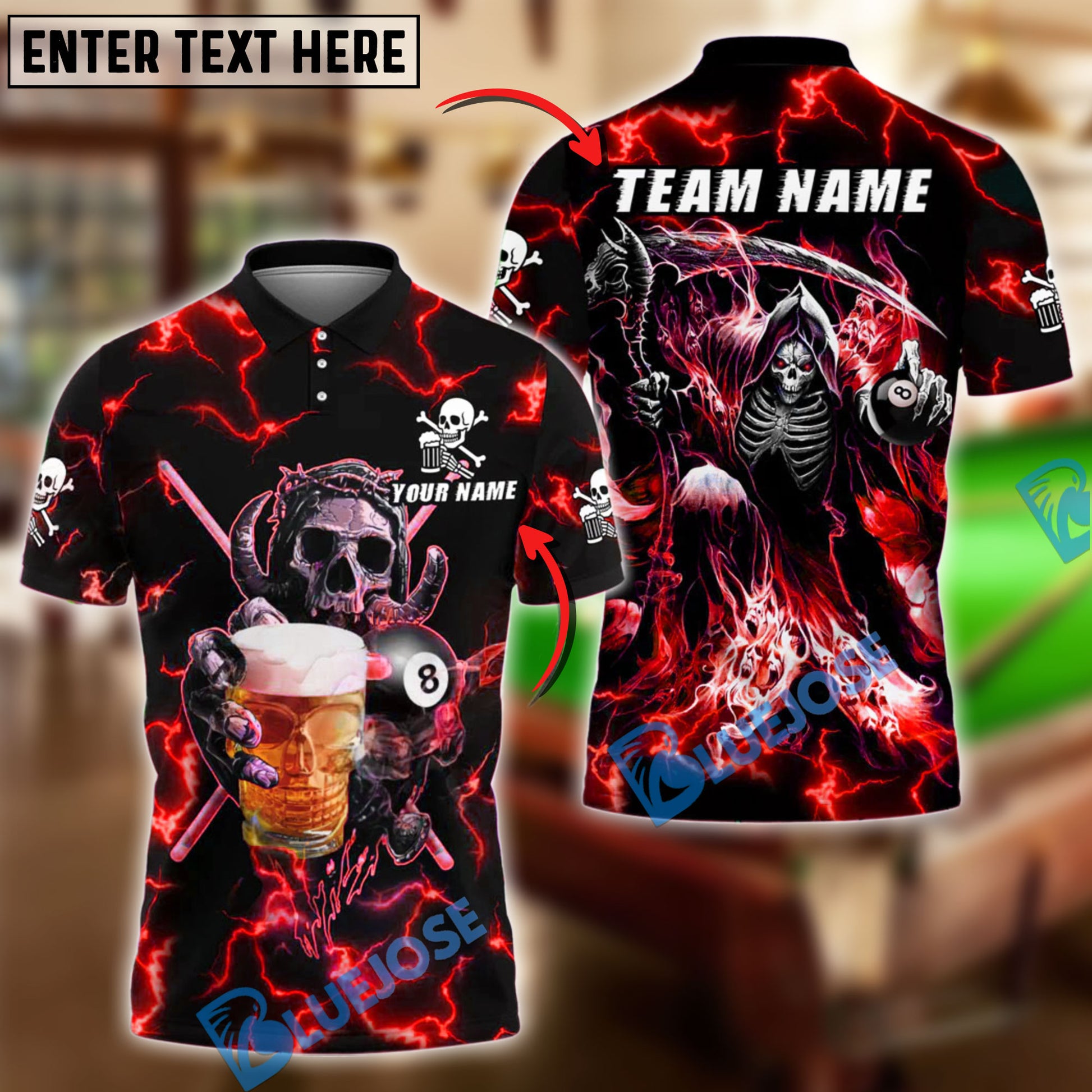 BlueJose Billiards 8-Ball Reaper Skull And Beer Personalized Name Shirt (4 Colors)