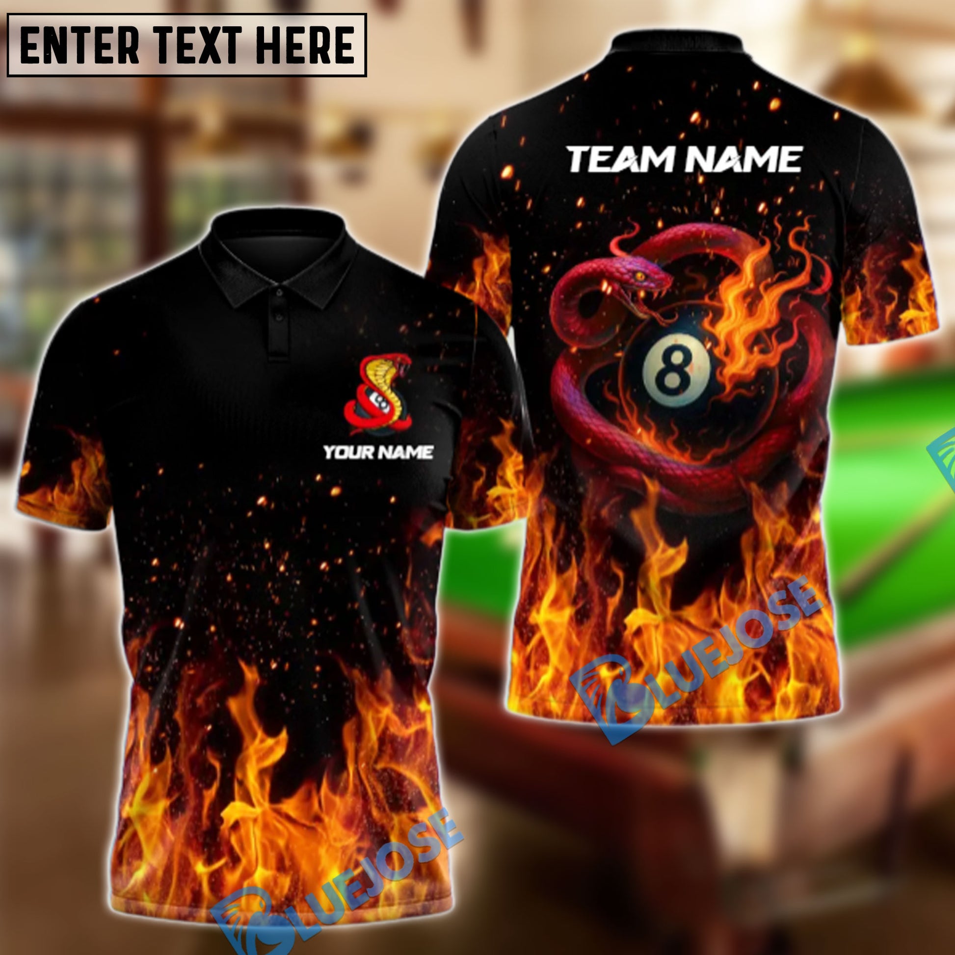 BlueJose Billiards 8-Ball Snake Fire Personalized Name Shirt (4 Colors)