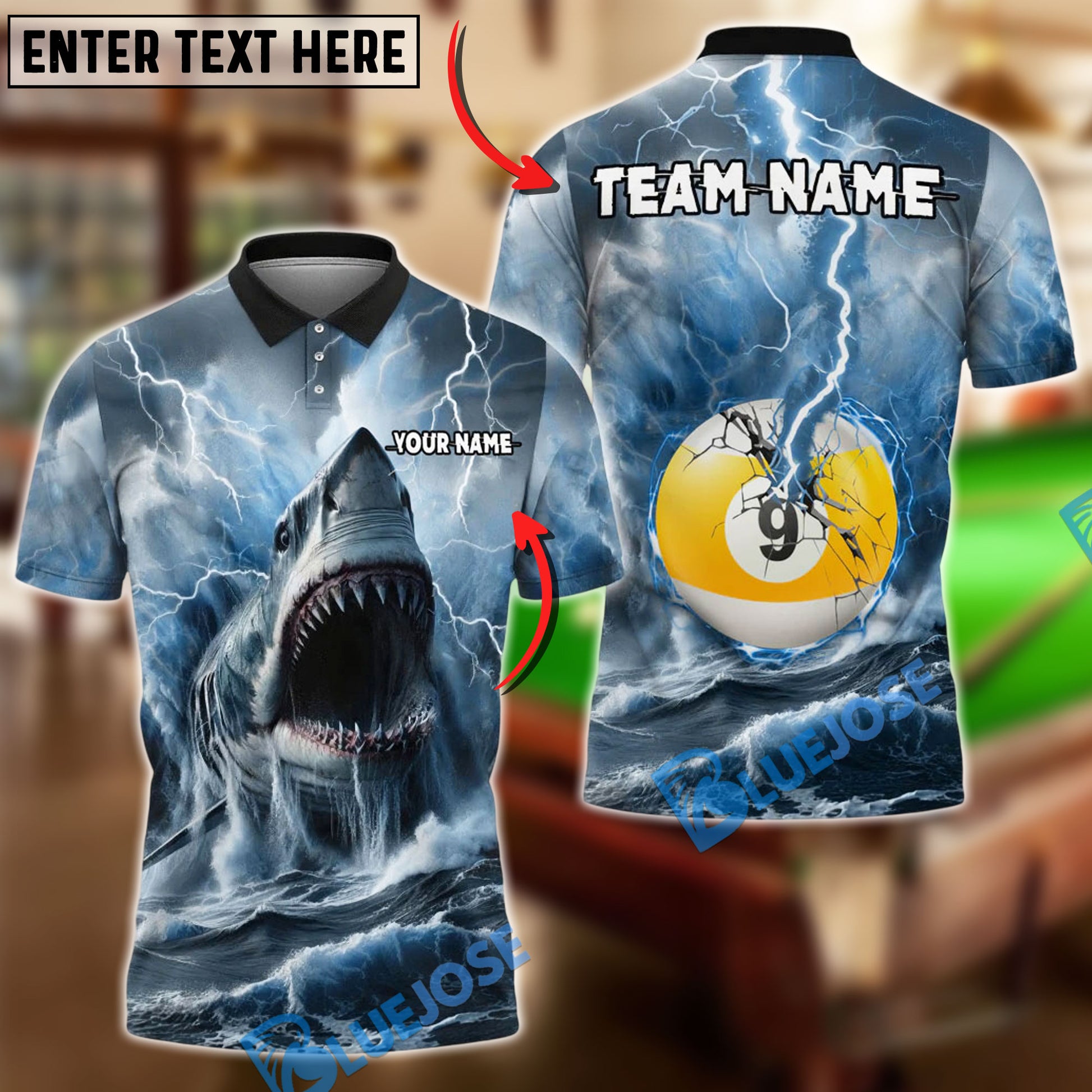 BlueJose Billiards 9 Ball Shark and Lightning Personalized Name, Team Name Unisex Shirt (4 Colors)
