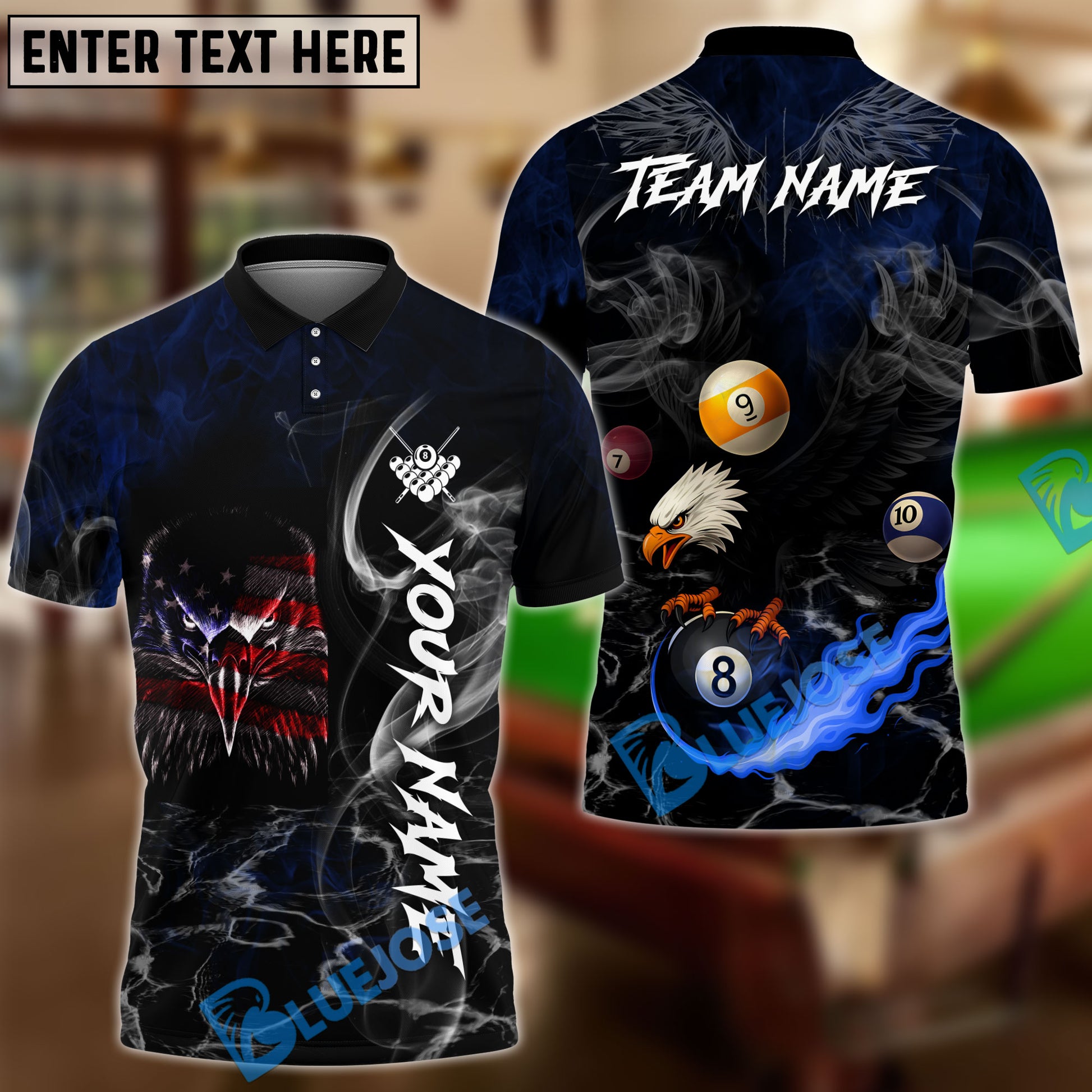 BlueJose Billiards Ball 8 American Flag Eagle Black Fire Personalized Name Shirt (4 Colors)