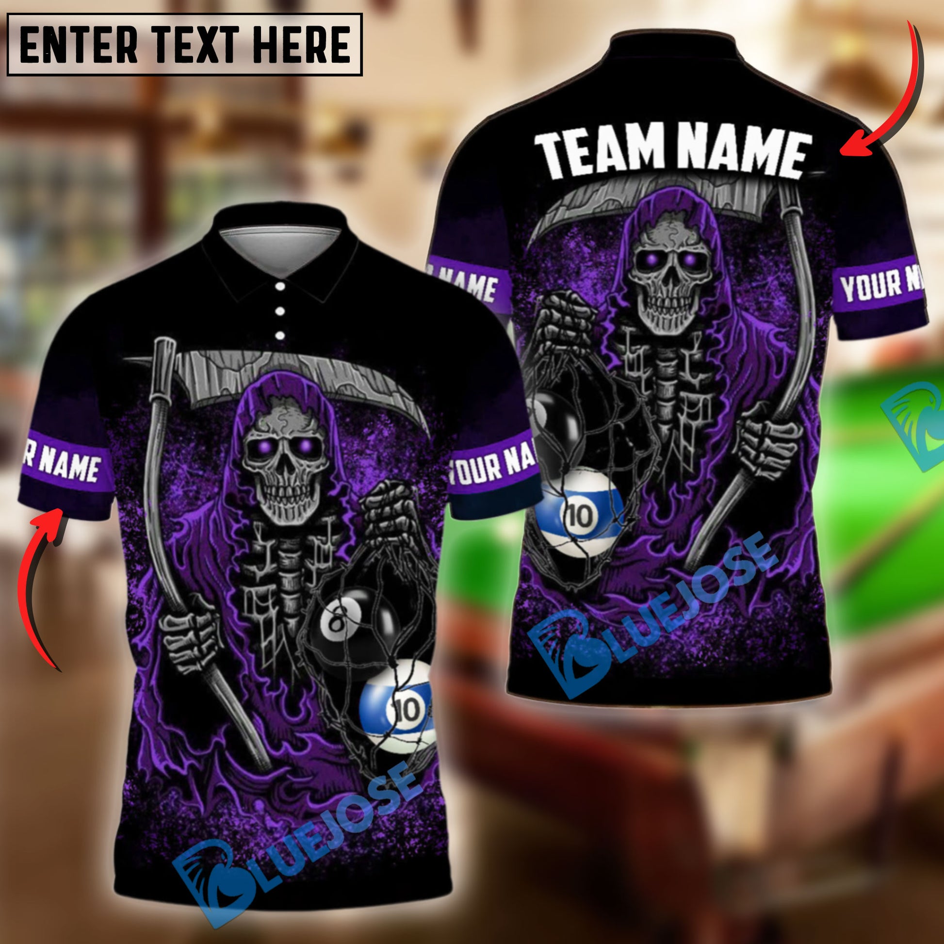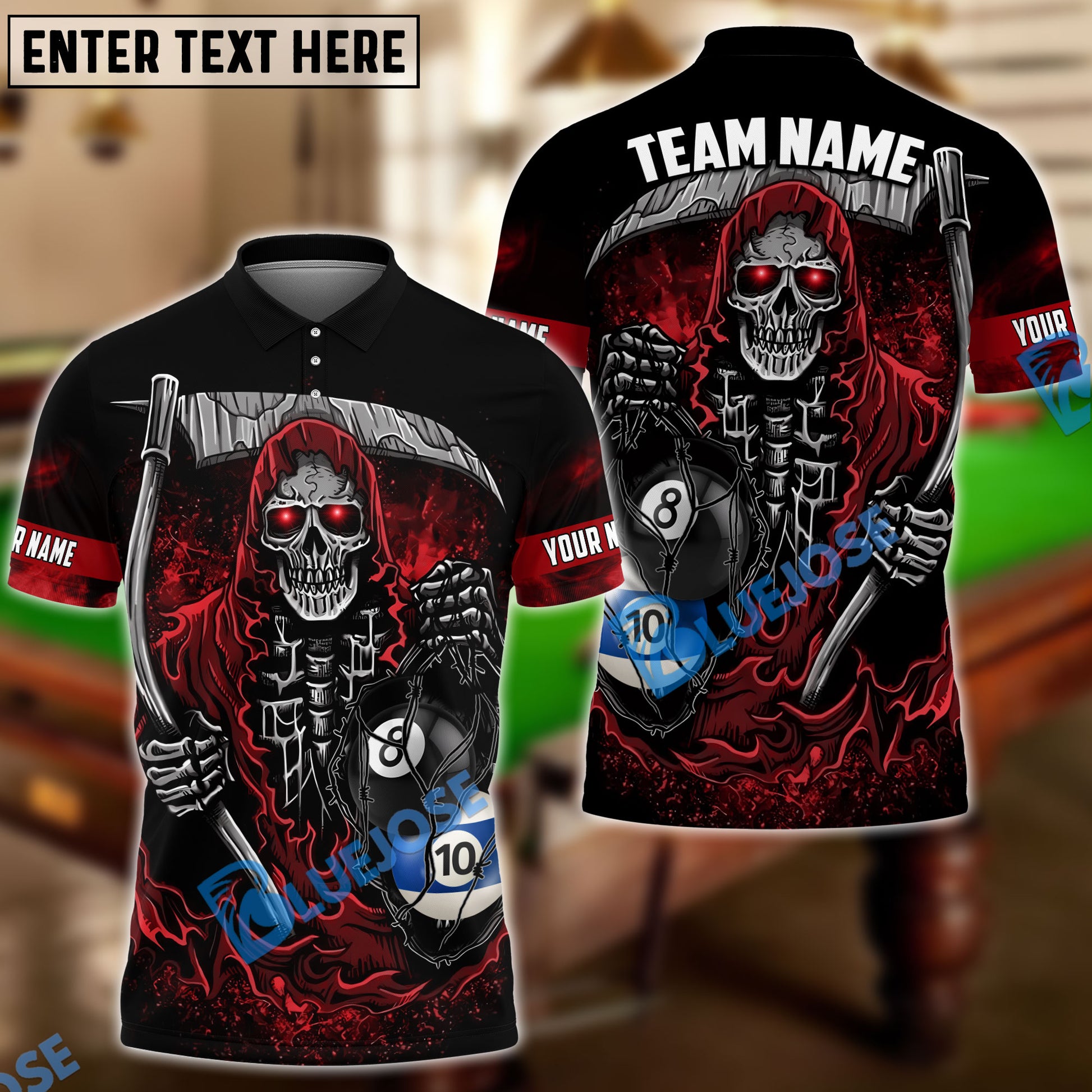 BlueJose Billiards Ball 8 & Ball 10 Reaper Personalized Name Shirt (4 Colors)