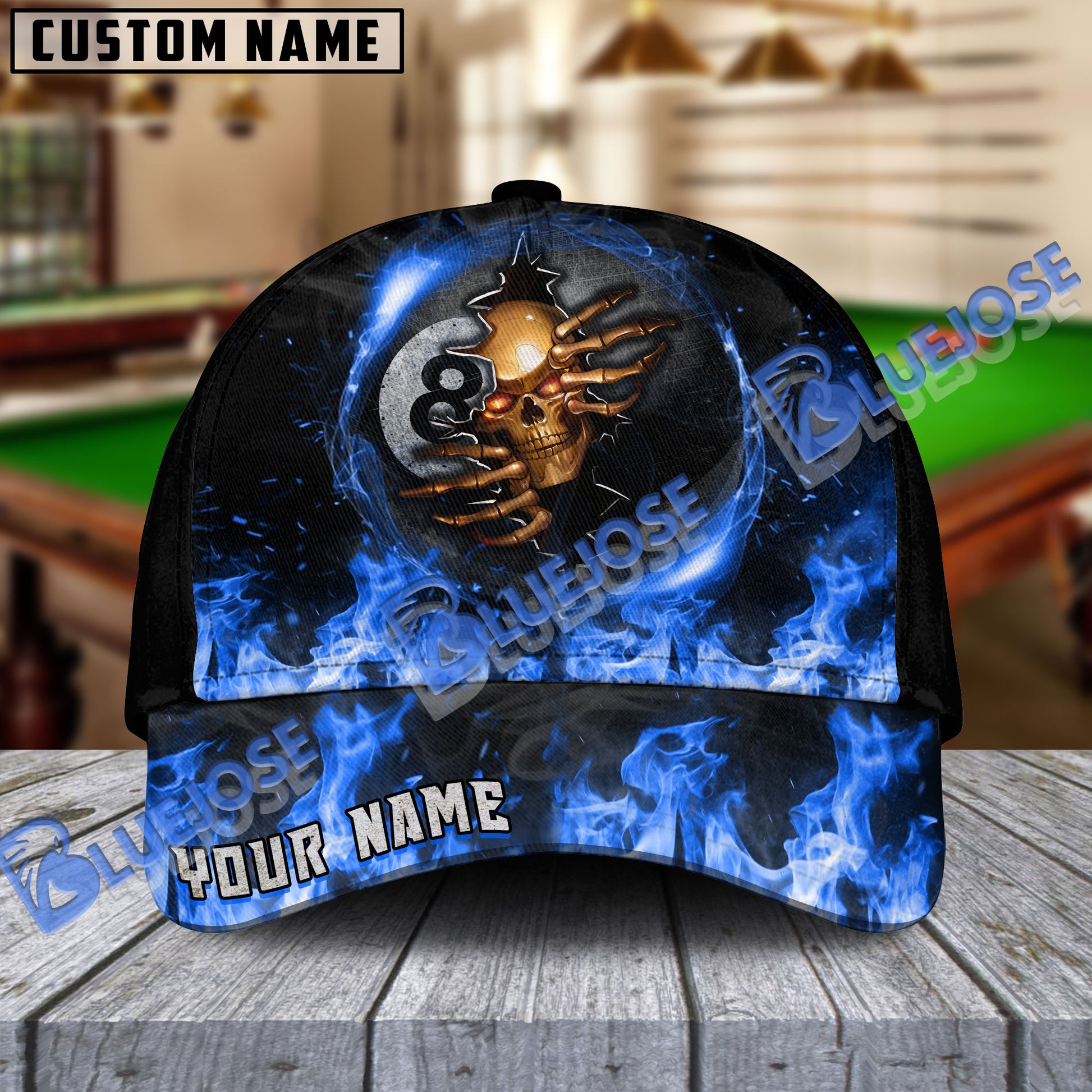 BlueJose Billiards Ball 8 Fire Skull Crack Personalized Name Cap (6 Colors)