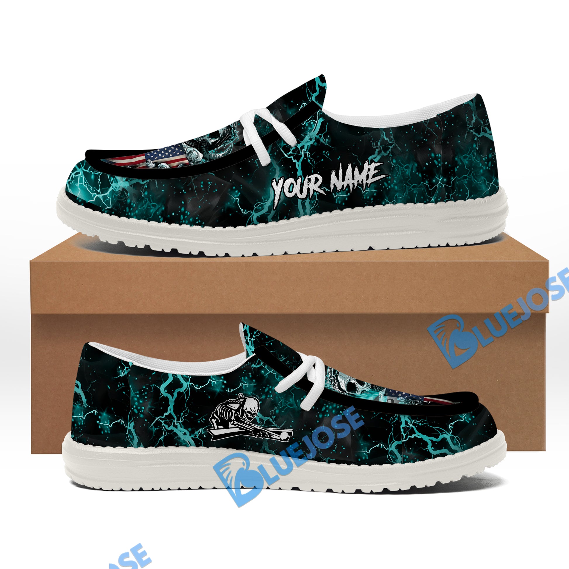 BlueJose Billiards Ball 8 Fire Skull US Flag Cyan White Canvas Loafer Shoes