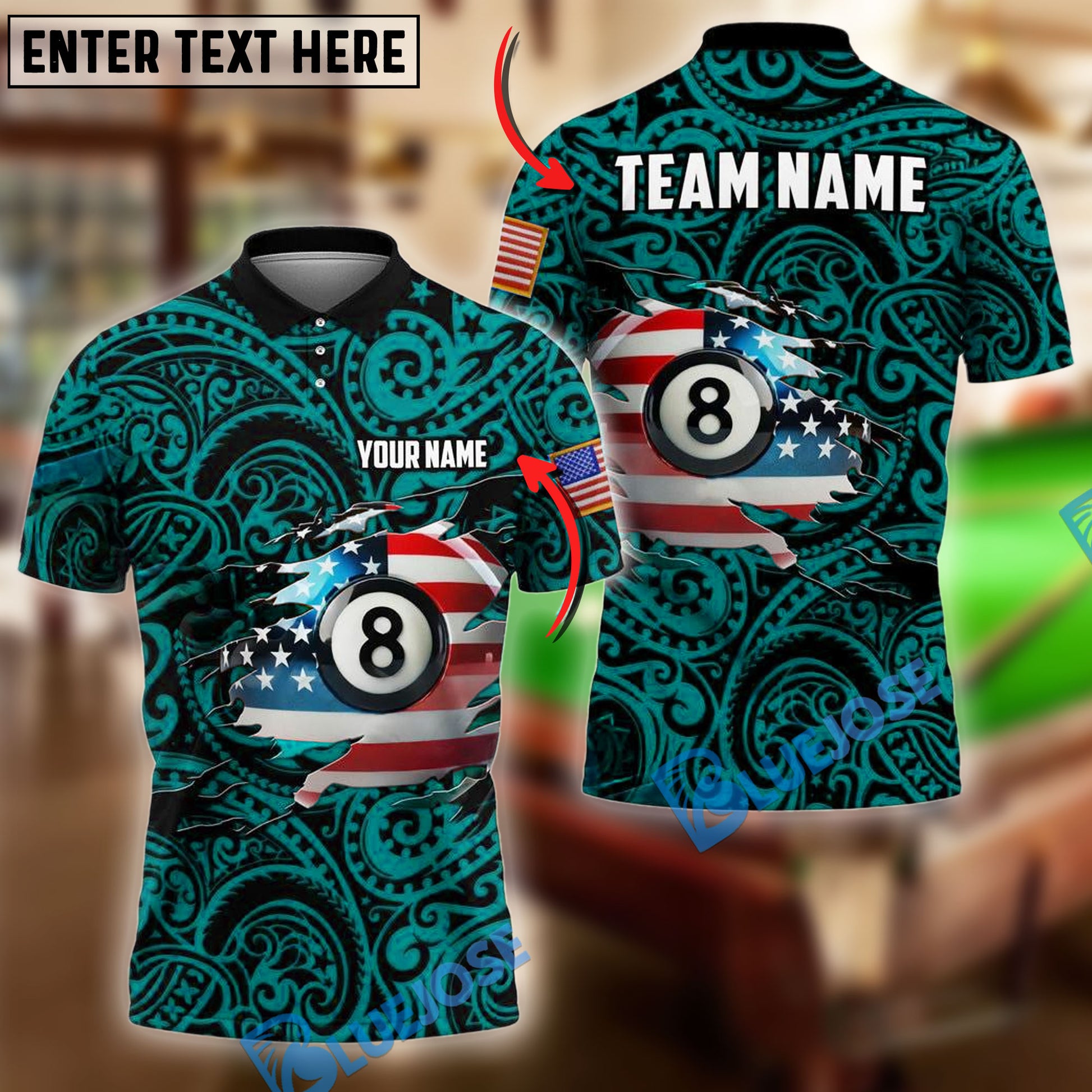 BlueJose Billiards American Flag 8-Ball With Tribal Pattern Personalized Name Shirt (4 Colors)