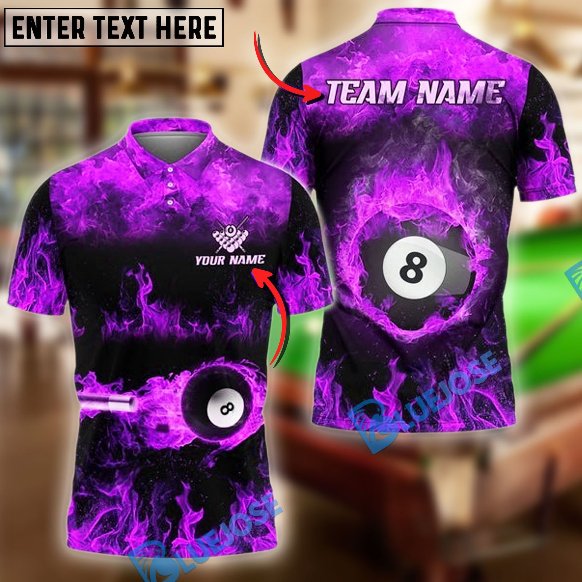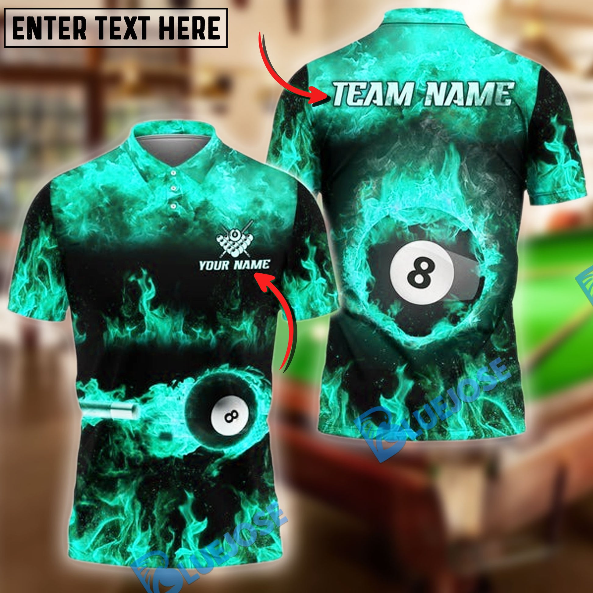 BlueJose Billiards Ball 8 Flame Pattern Personalized Name, Team Name Shirt (6 Colors)