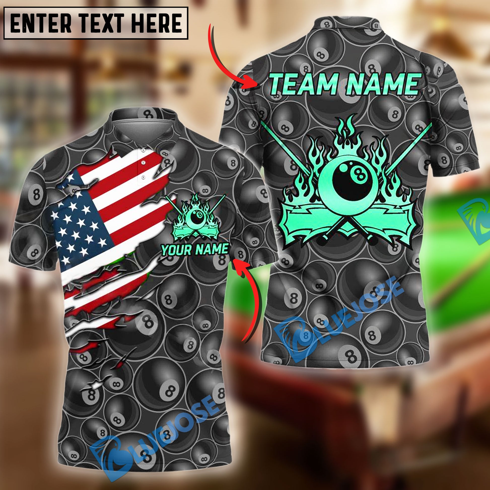 BlueJose Billiards Ball 8 Golden Flames American Flag Ripped Personalized Name Shirt (4 Colors)