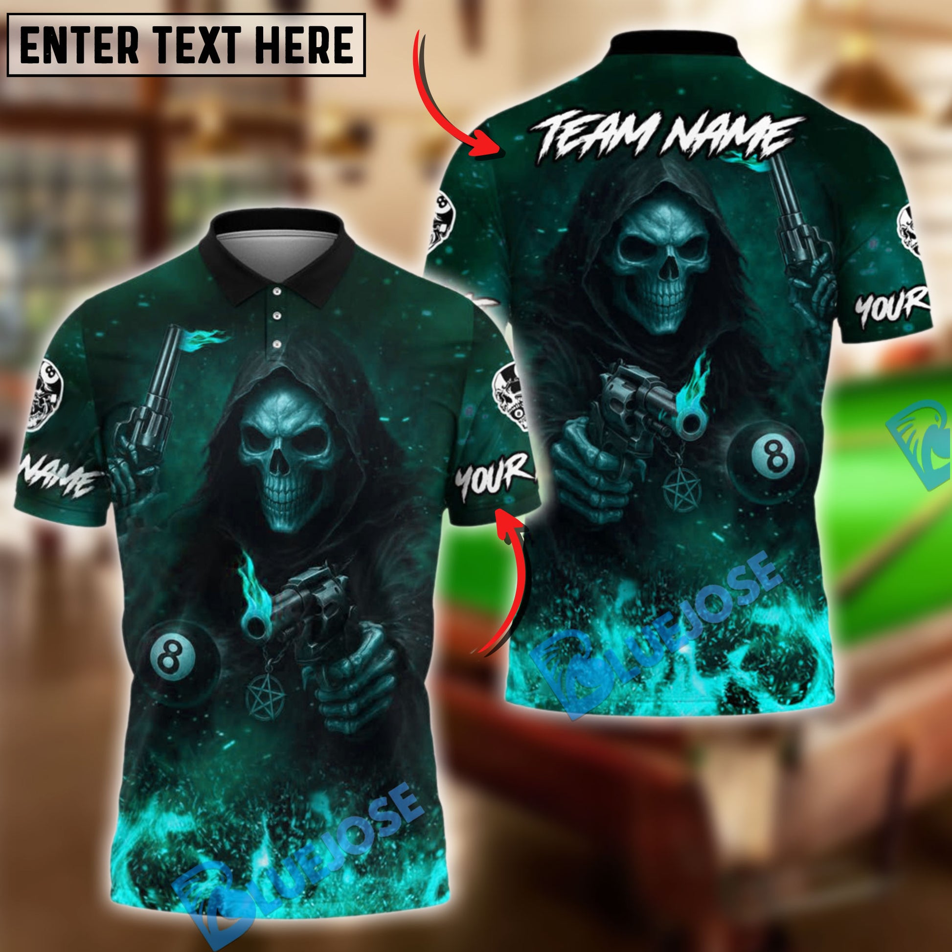 BlueJose Billiards Ball 8 Grim Reaper Flaming Skull & Gun Personalized Name Shirt (4 Colors)
