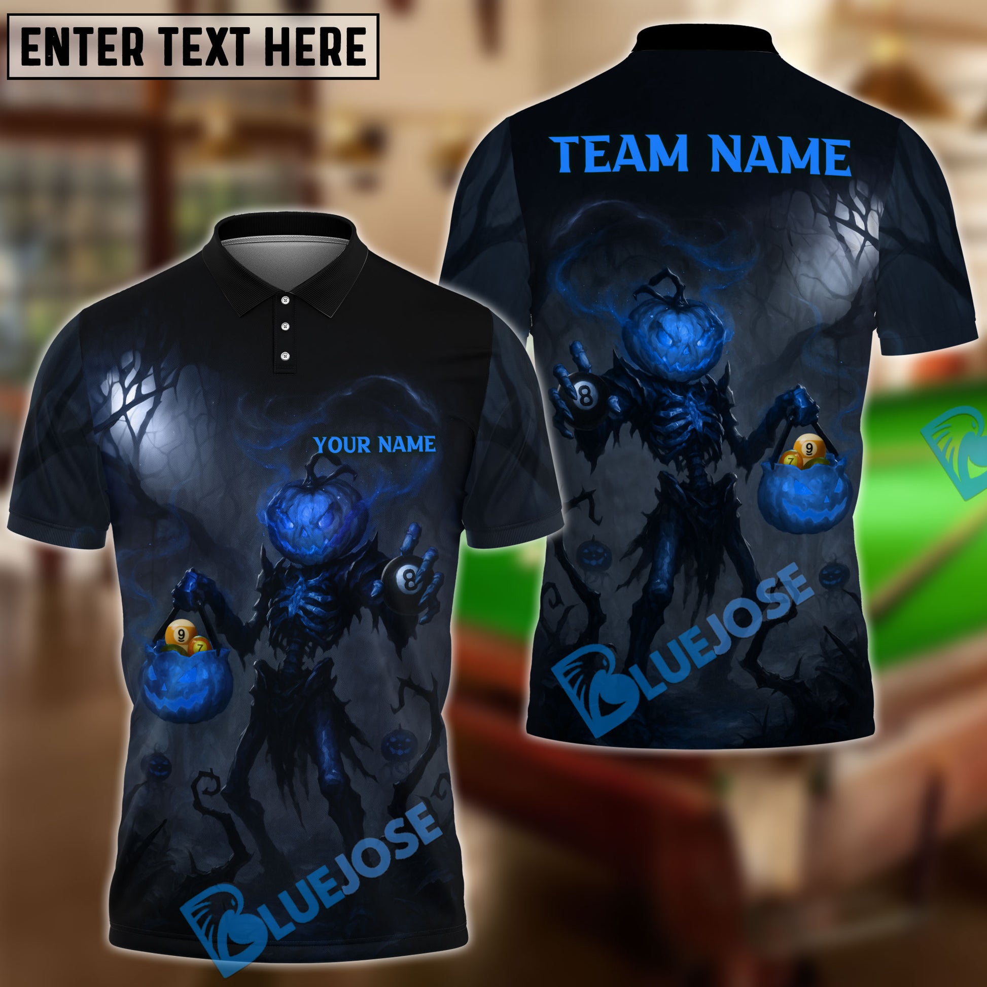BlueJose Billiards Ball 8 Halloween Pumpkin Head Hollow Night Personalized Name, Team Name Unisex Shirt (4 Colors)