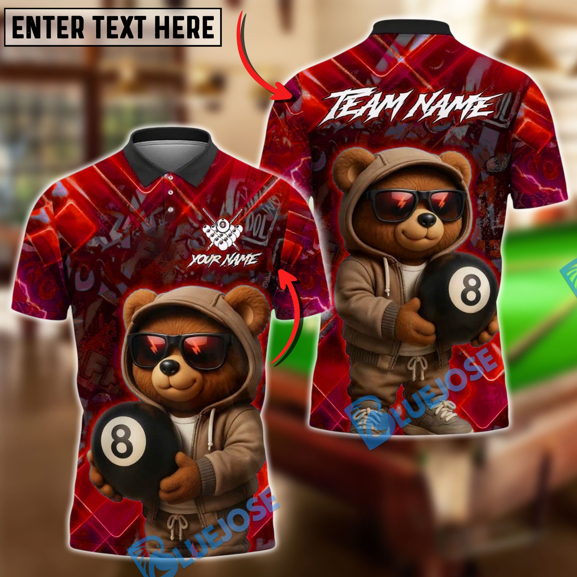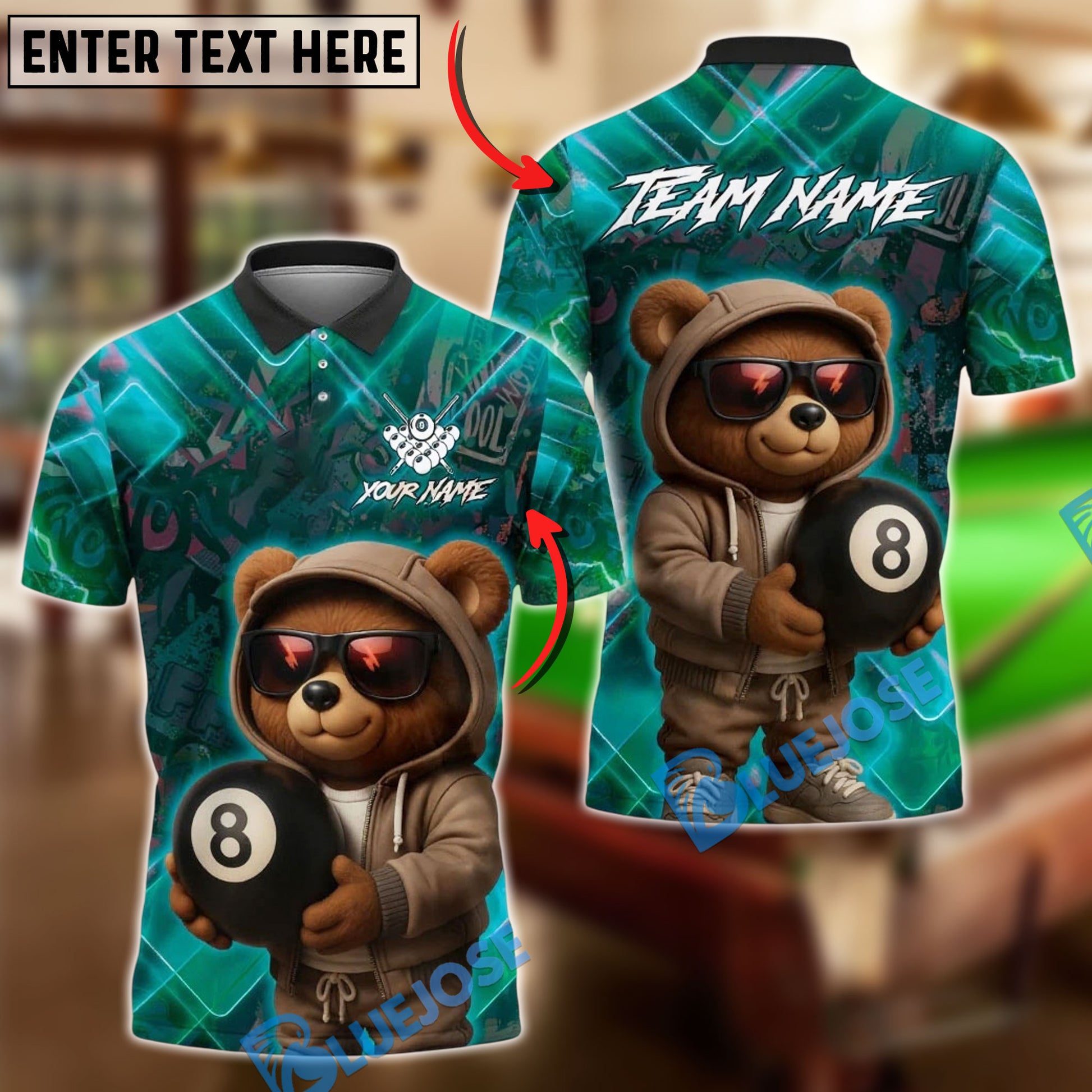 BlueJose Billiards Ball 8 Pool Cool Bear Personalized Name, Team Name Unisex Shirt (4 Colors)
