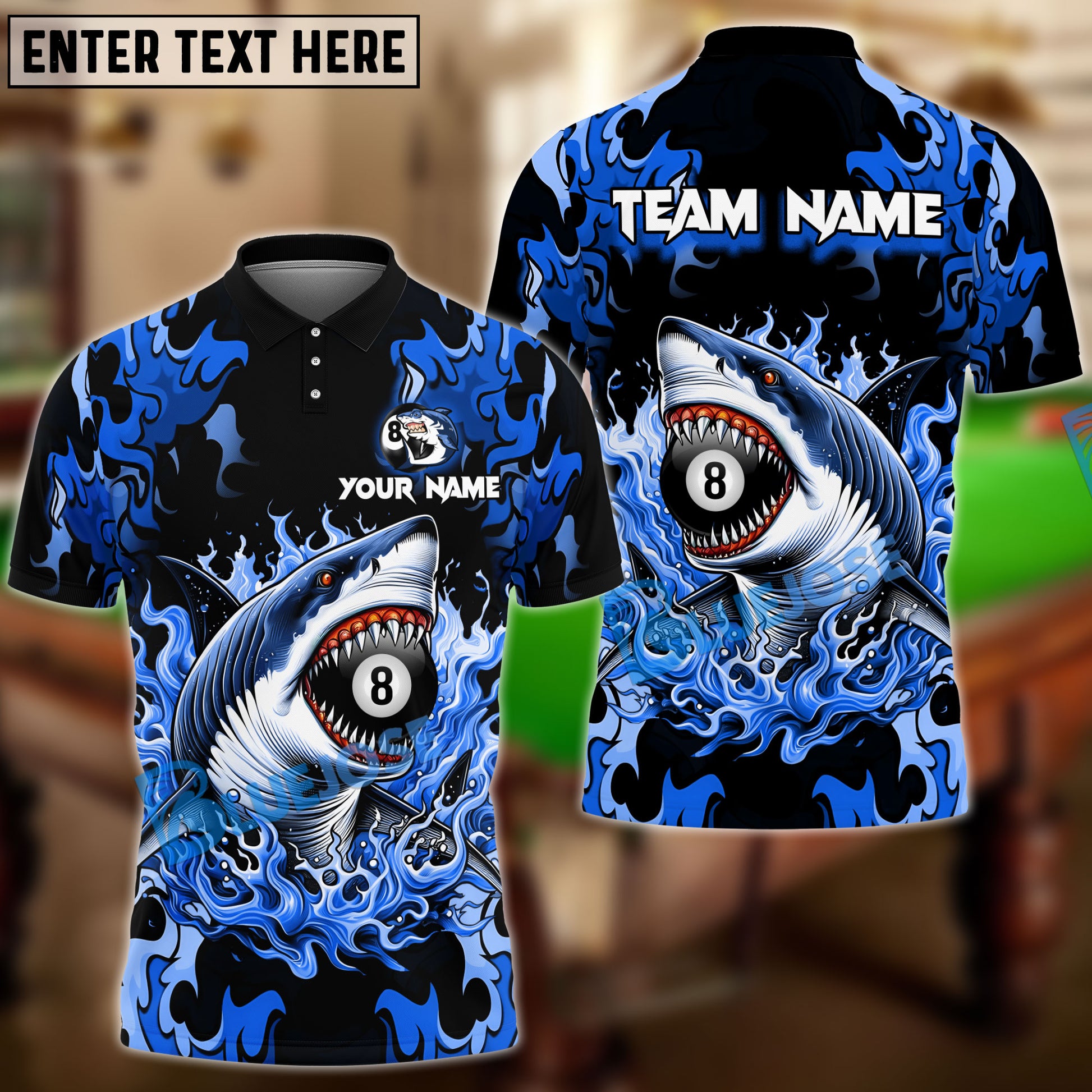 BlueJose Billiards Ball 8 Pool Flame Shark Personalized Name Shirt (4 Colors)