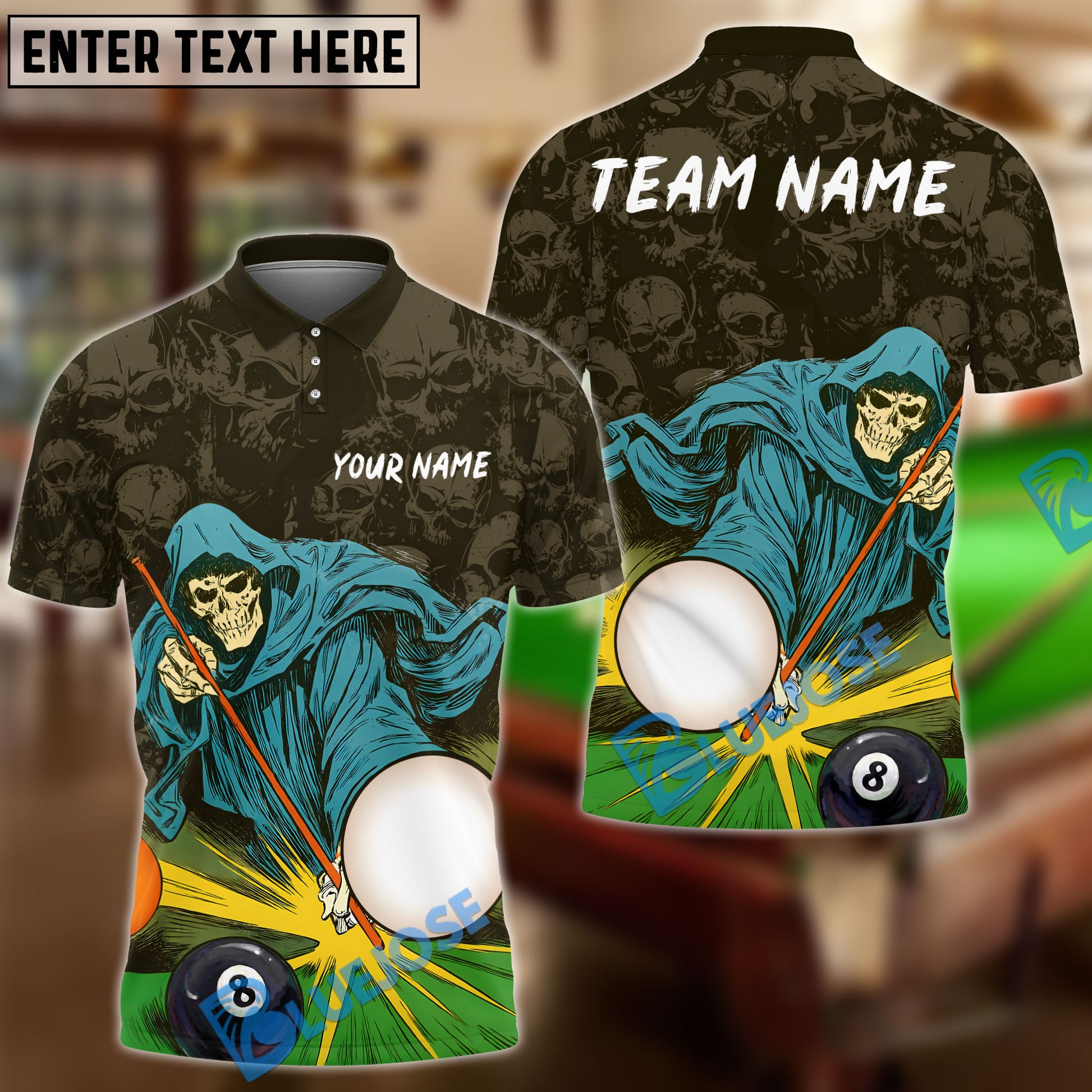 BlueJose Billiards Ball 8 Pool Reaper Comic Style Personalized Name, Team Name Unisex Shirt