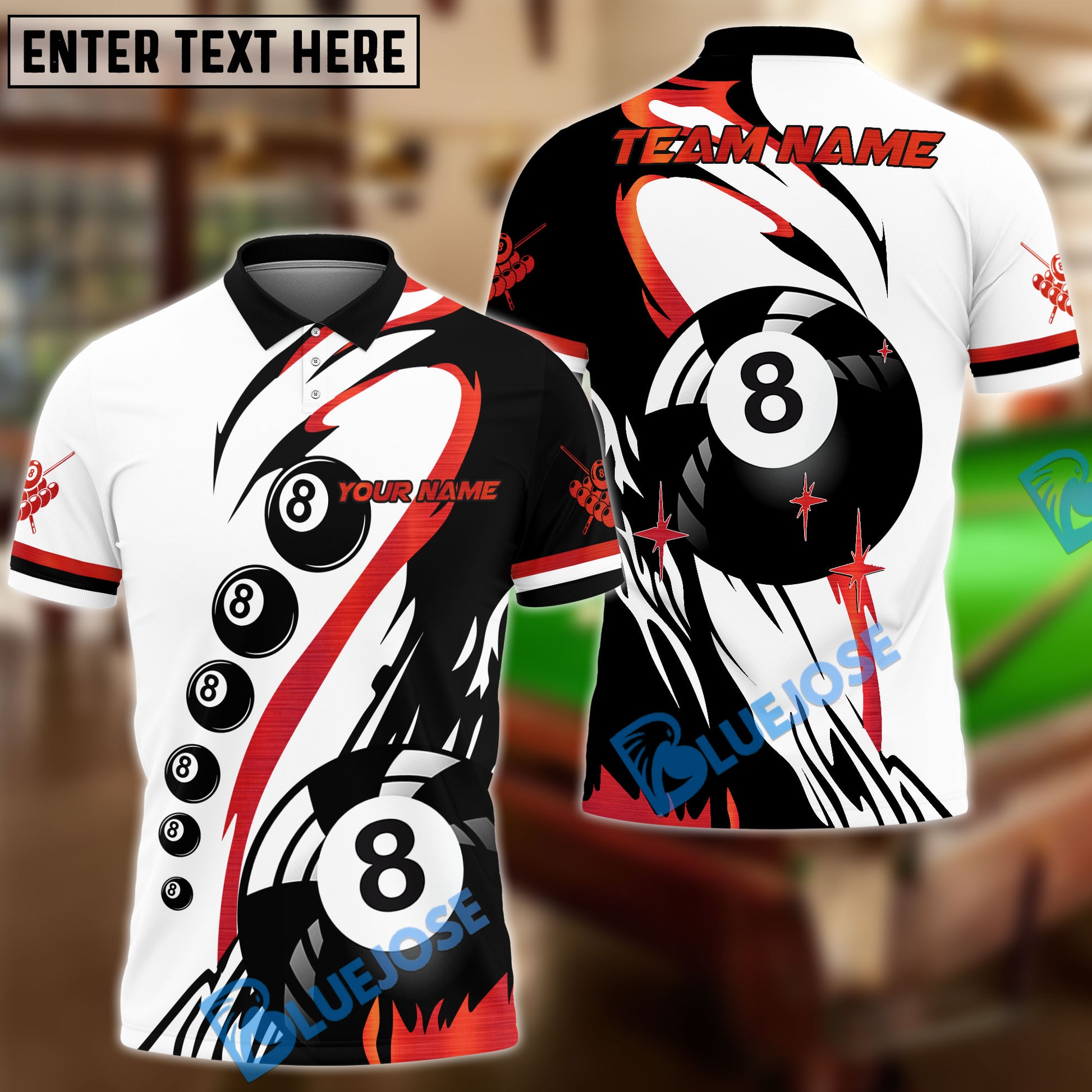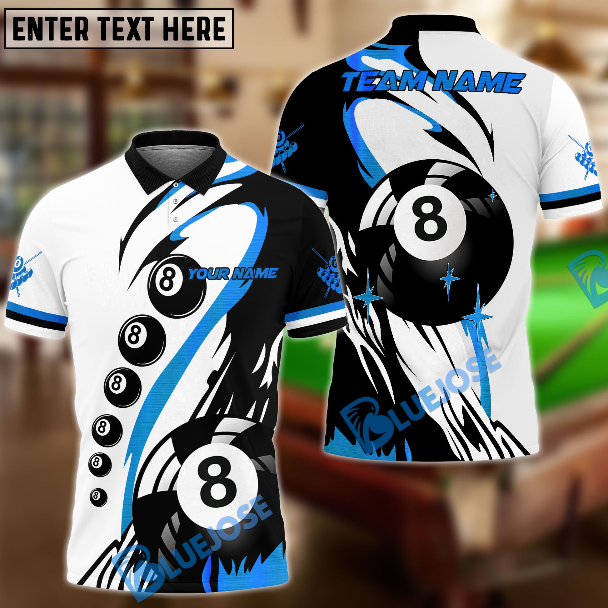 BlueJose Billiards Classic 8-Ball Black & White Personalized Name Shirt (4 Colors)