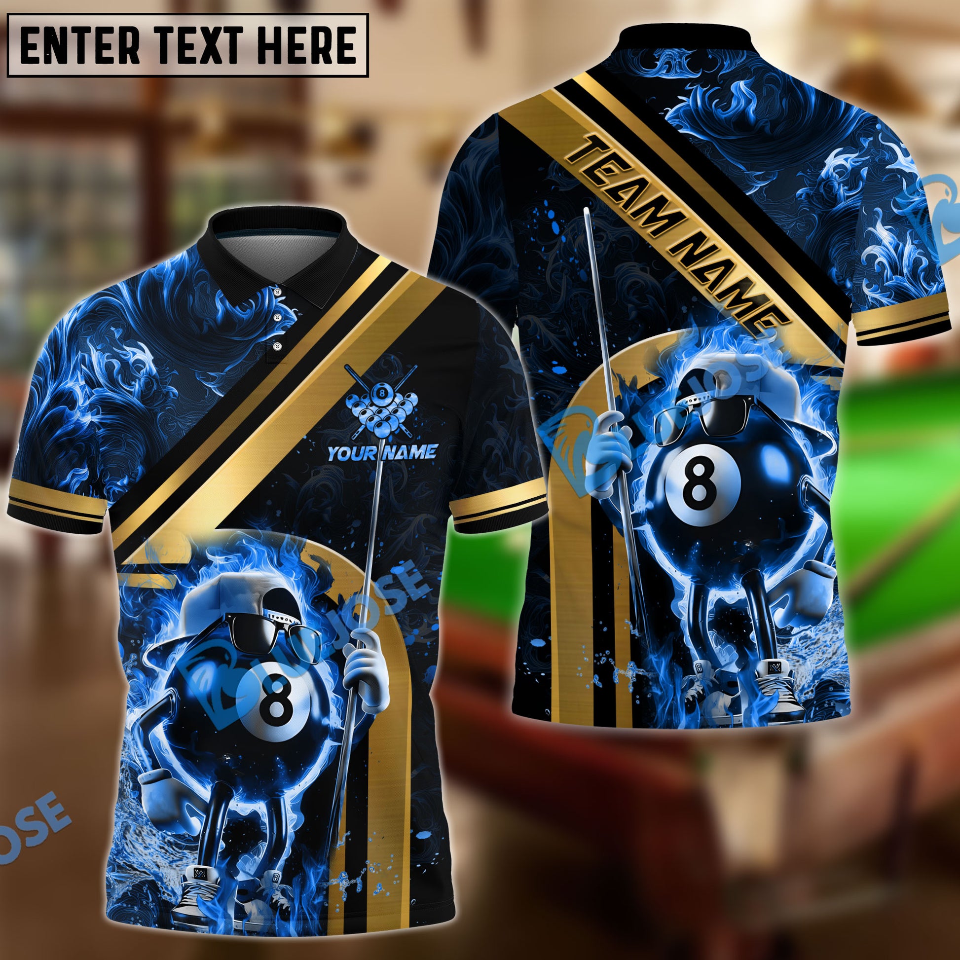 BlueJose Billiards Cool 8 Ball Cartoon Fire Flames Golden Line Style Personalized Name, Team Name Unisex Shirt (4 Colors)