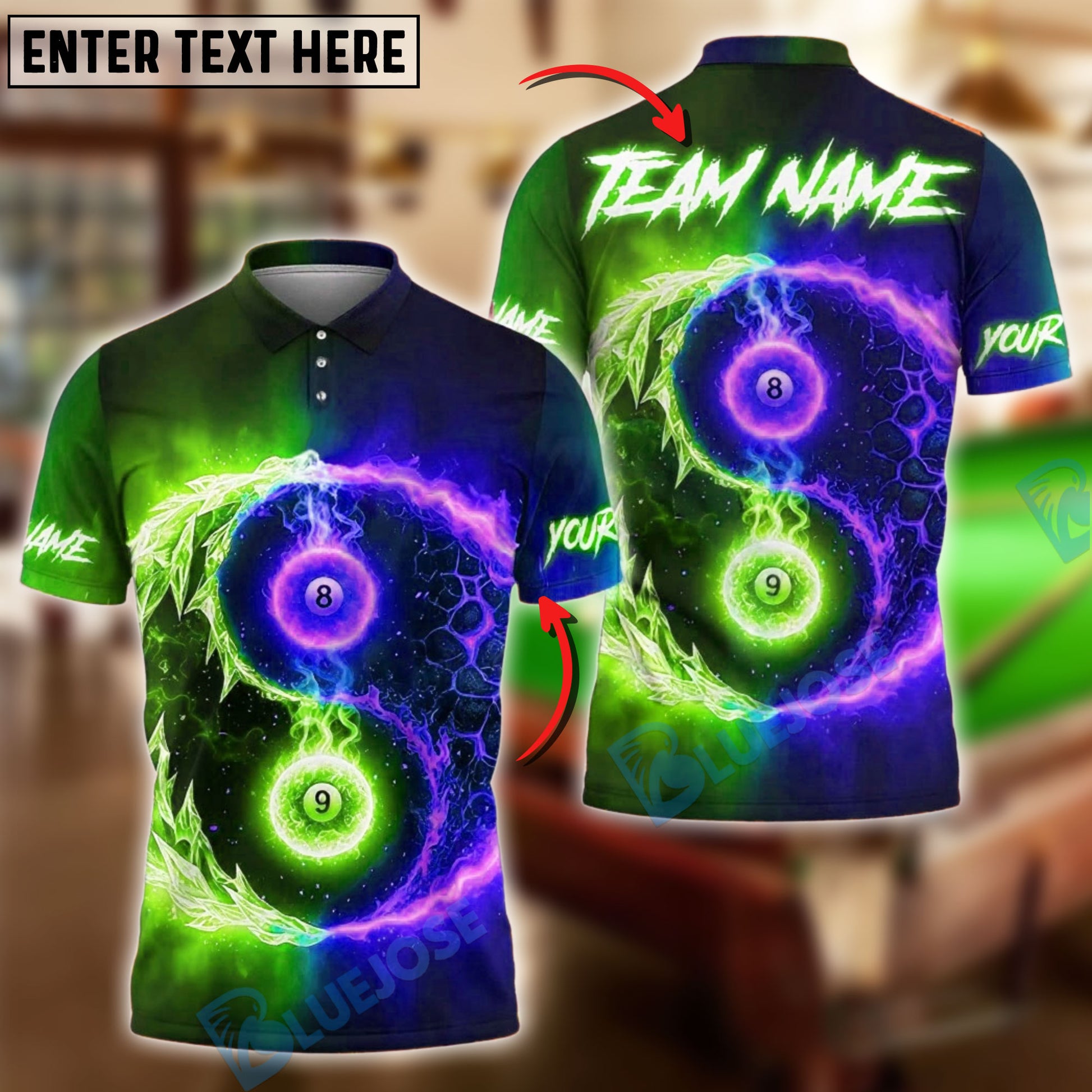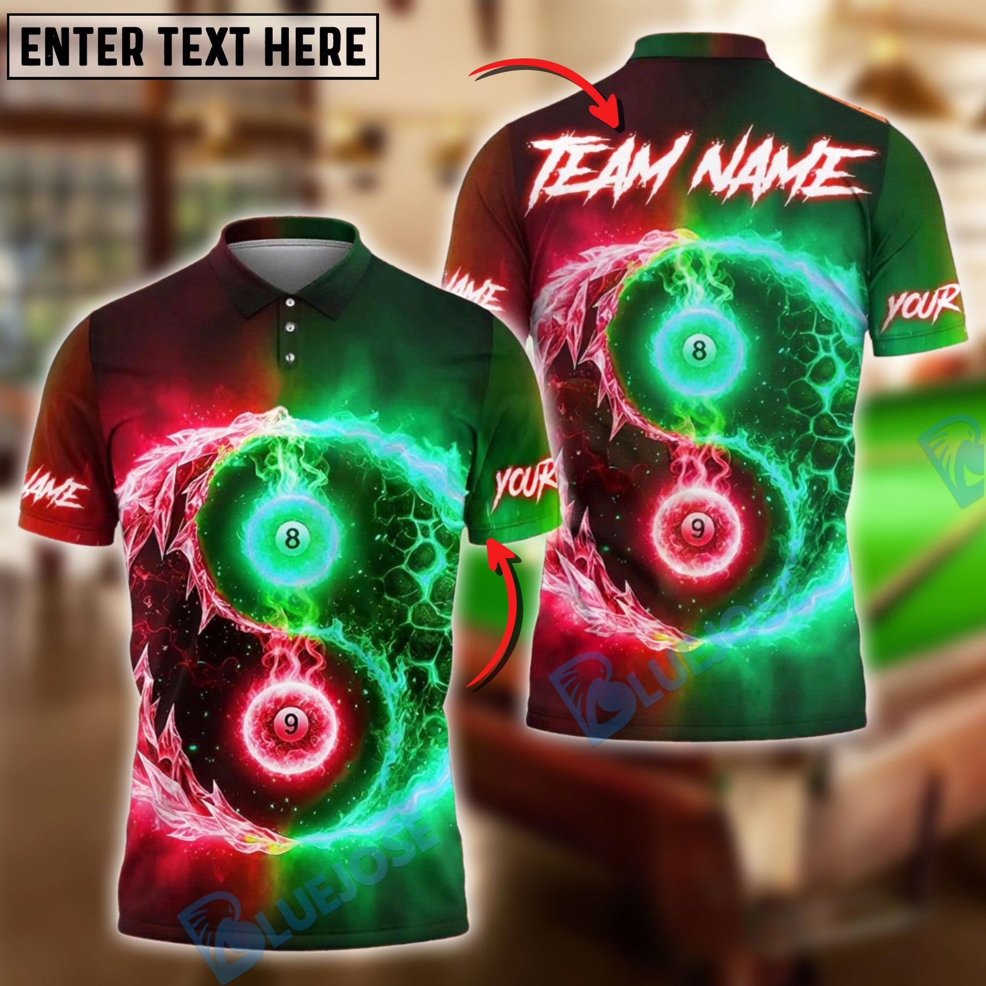 BlueJose Billiards Fire & Ice Ball 8&9 Personalized Name Shirt (4 Colors)