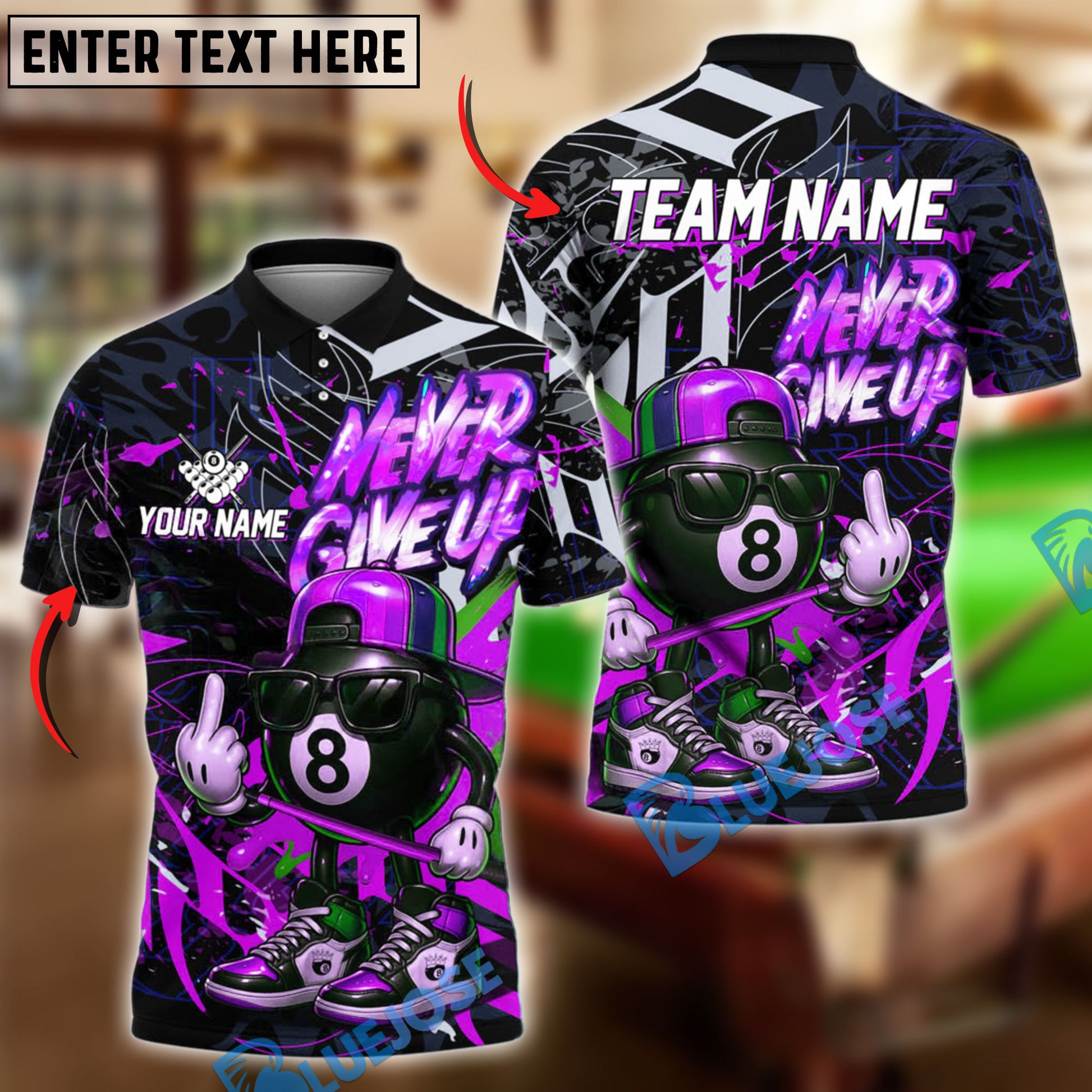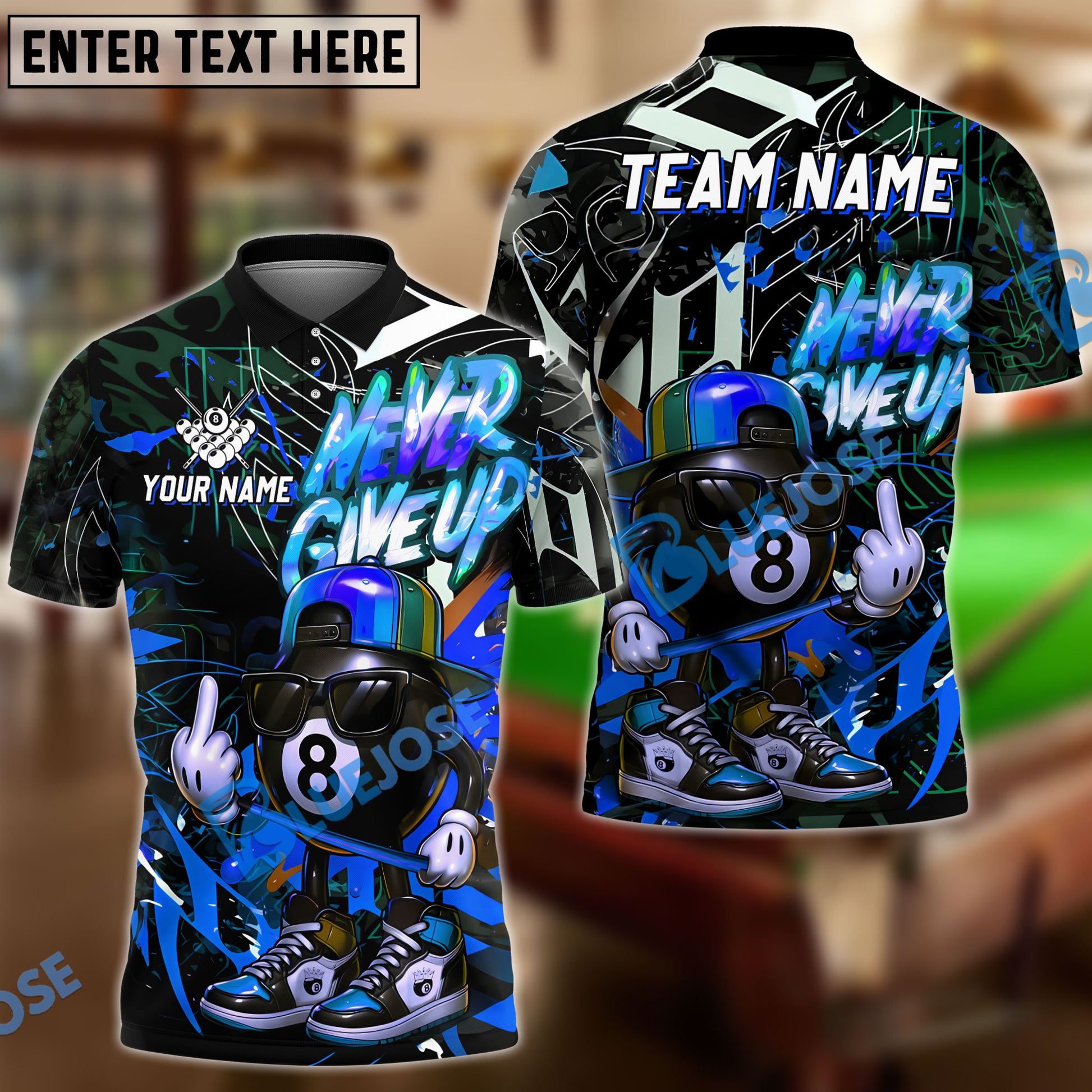 BlueJose Billiards Funny Never Give Up 8-Ball Personalized Name Shirt (4 Colors)