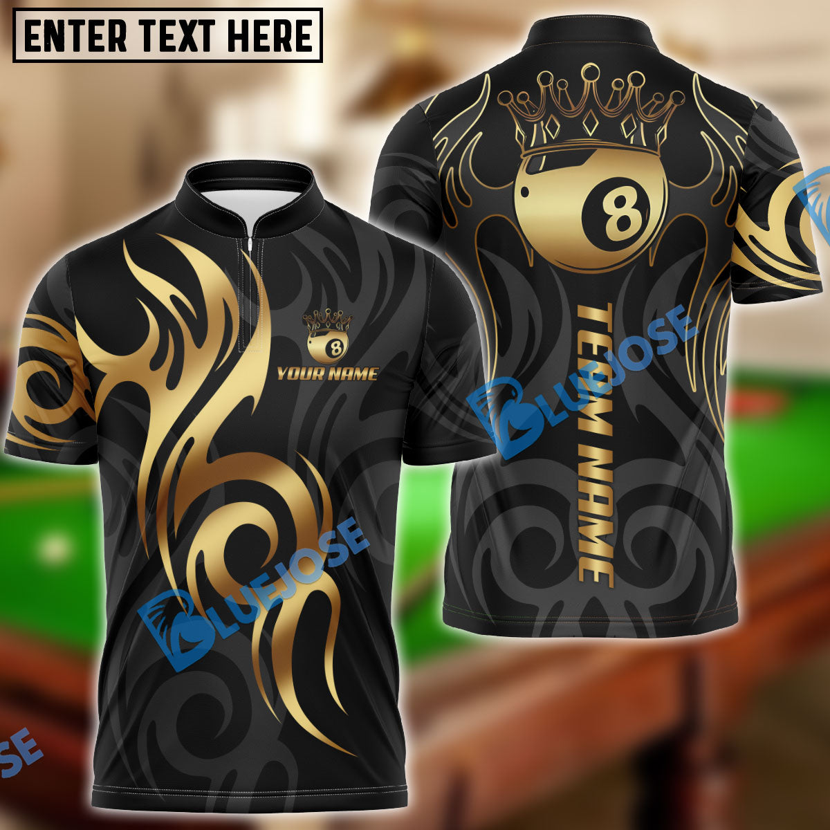 BlueJose Billiards Golden 8 Ball Crown Tribal Pattern Personalized Name, Team Name Shirt (6 Colors)