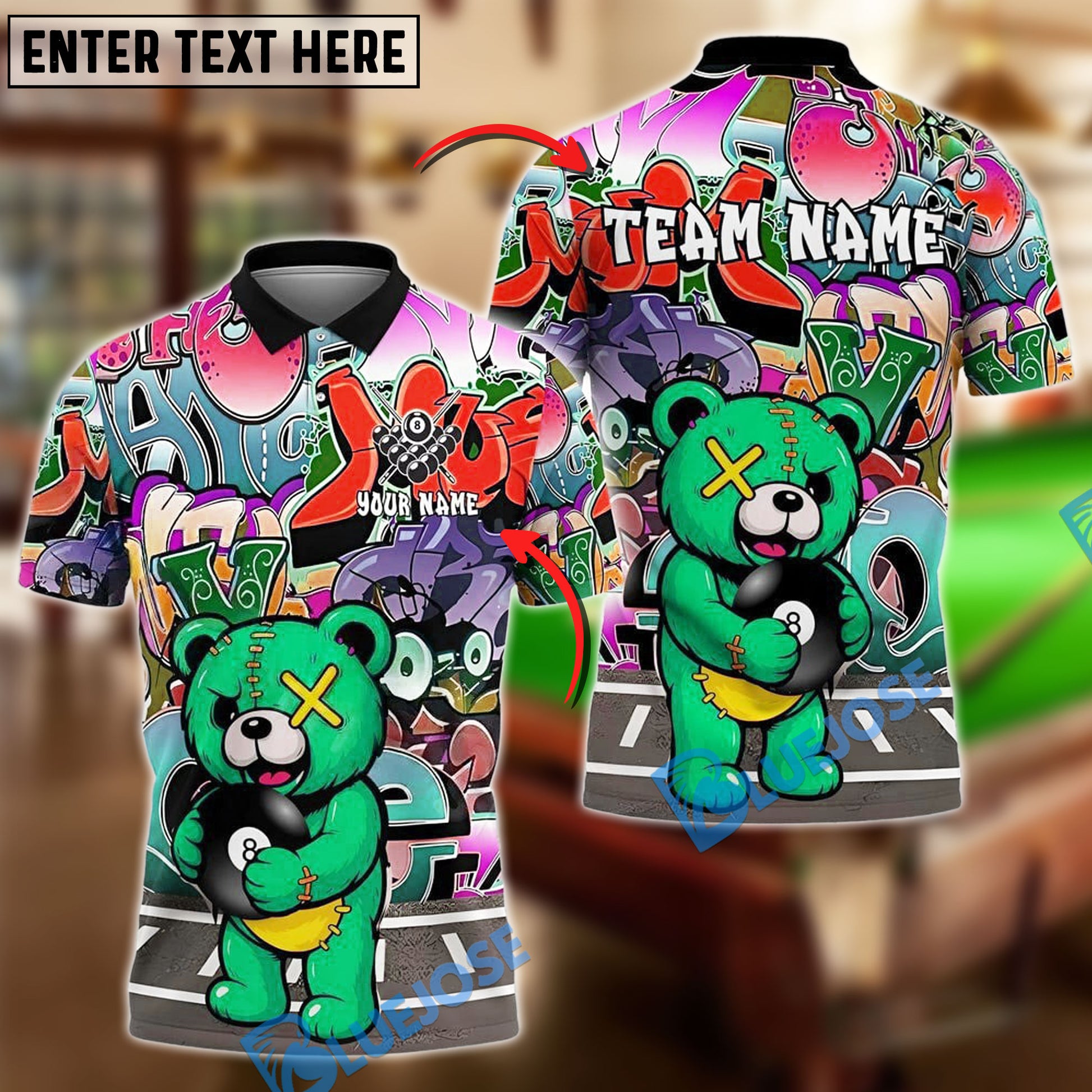 BlueJose Billiards Street Style 8-Ball Teddy Bear Personalized Name Shirt (4 Colors)