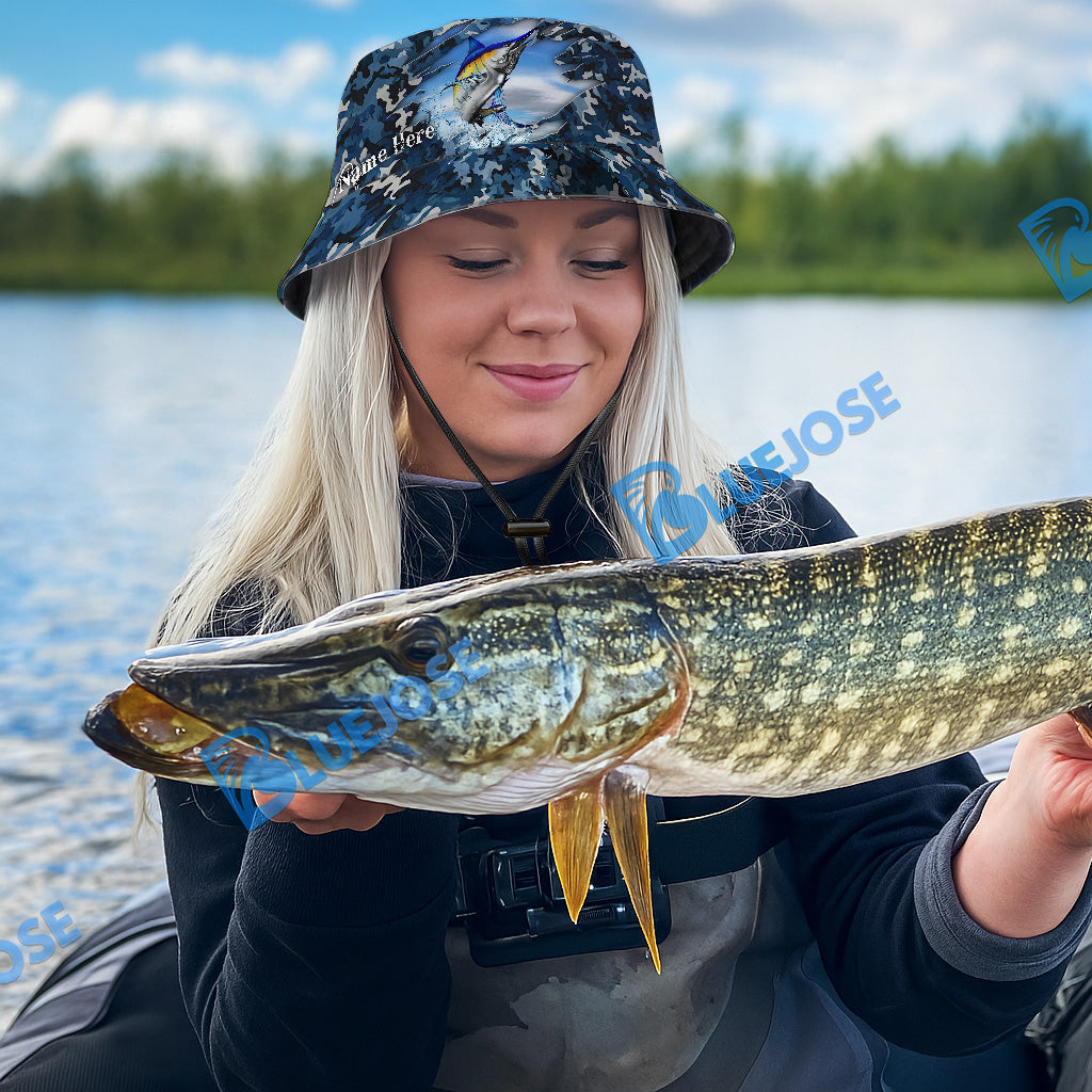 BlueJose Blue Marlin Camouflage Custom Name Bucket Hat
