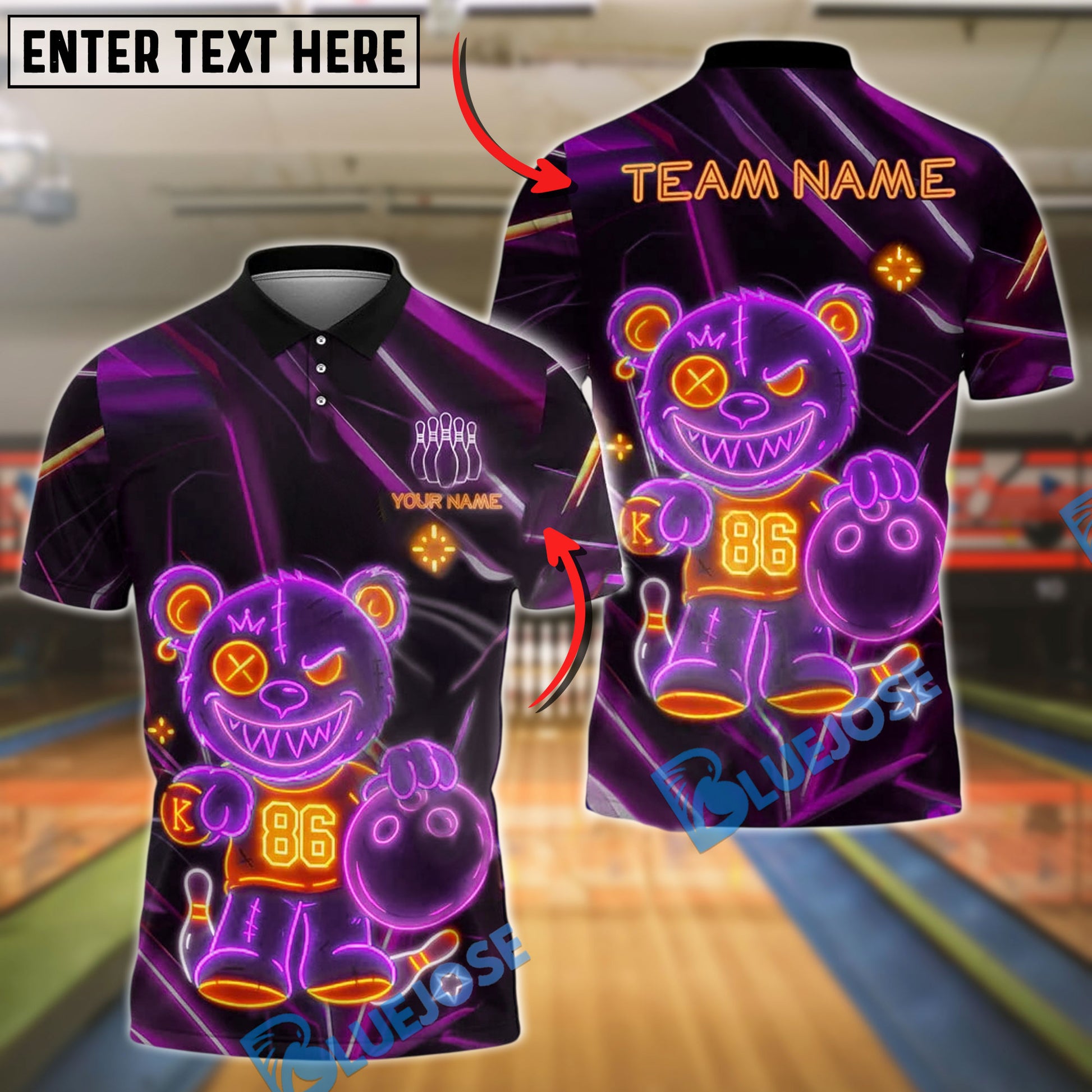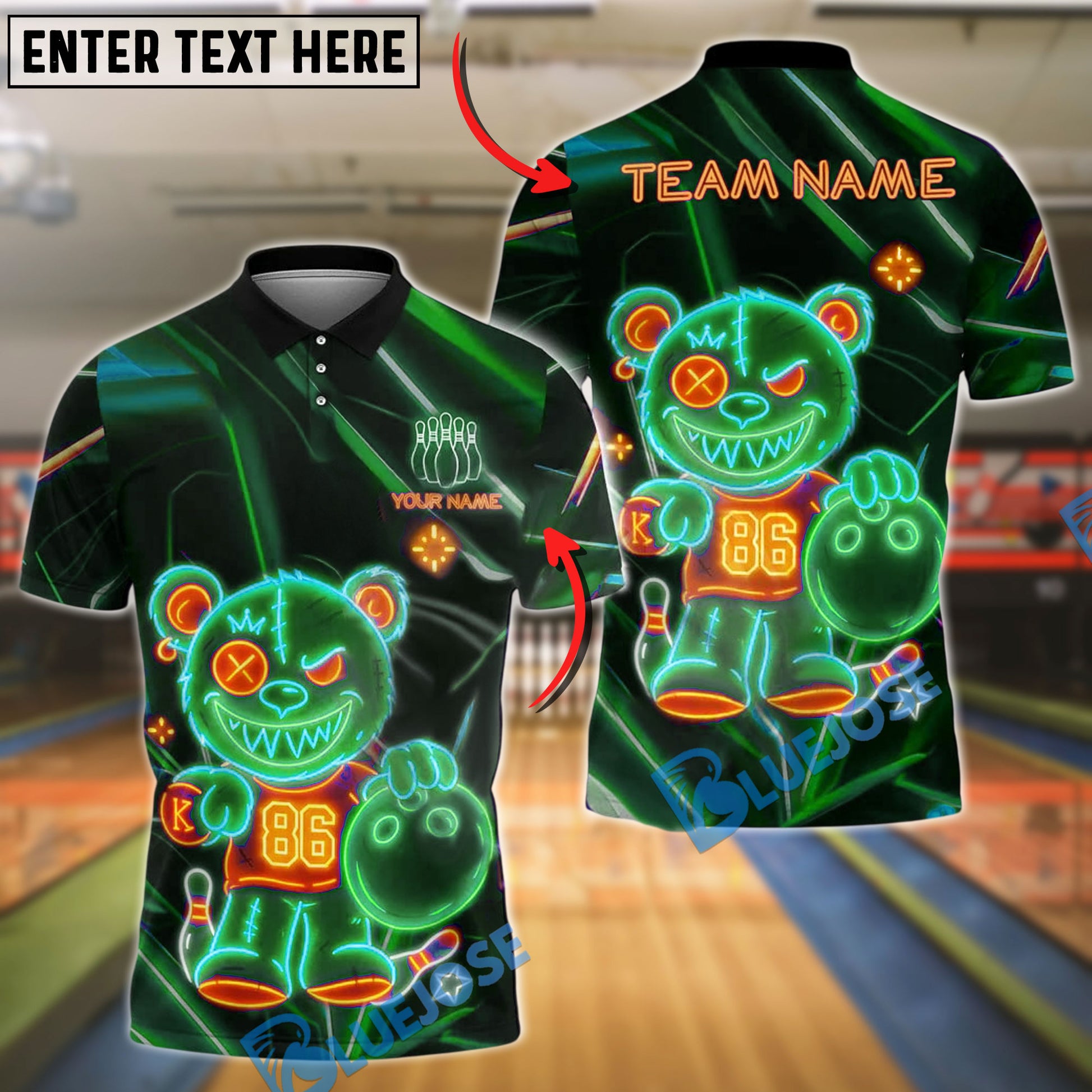 BlueJose Bowling And Pins Bear Neon Glow Customized Name, Team Name 3D Shirt (4 Colors)