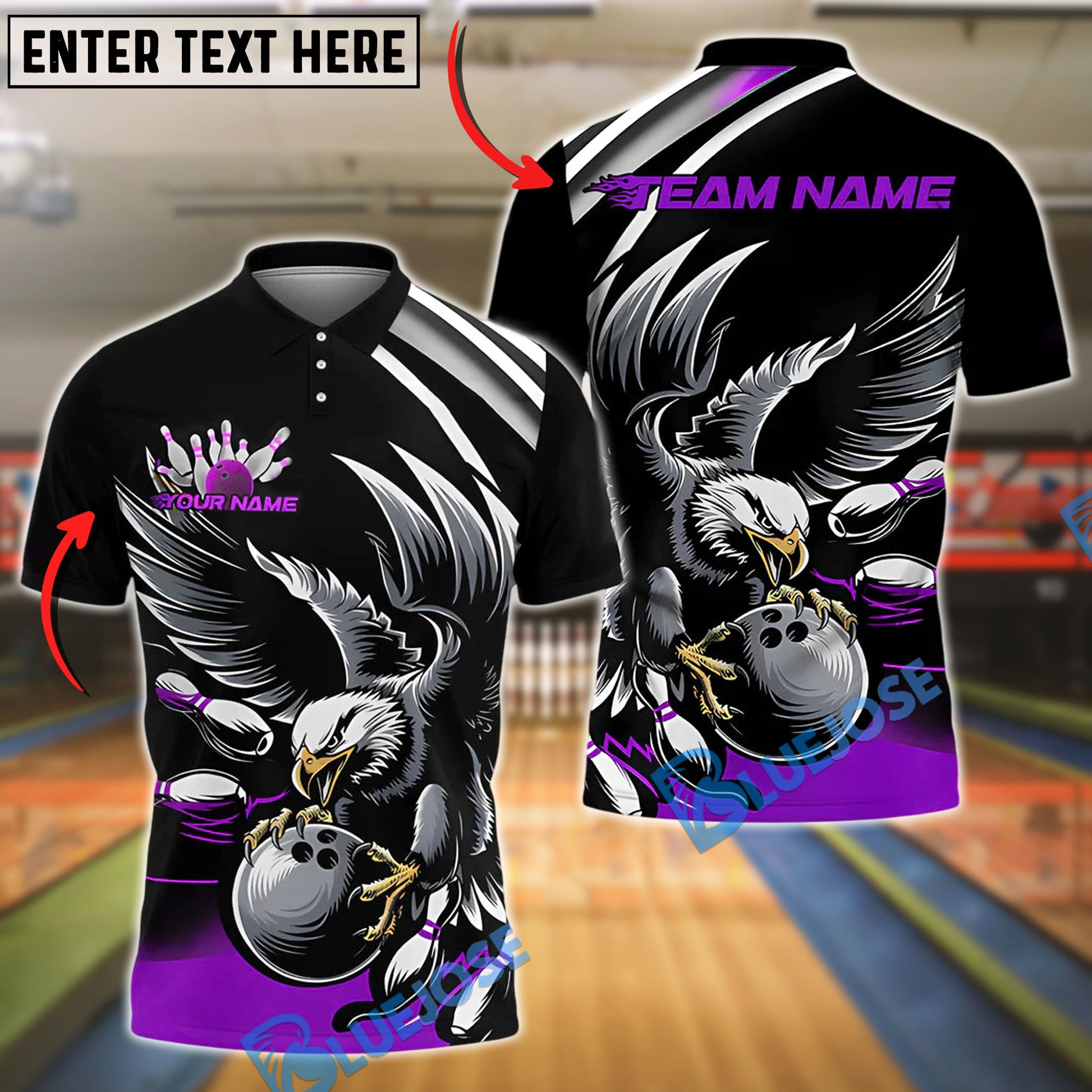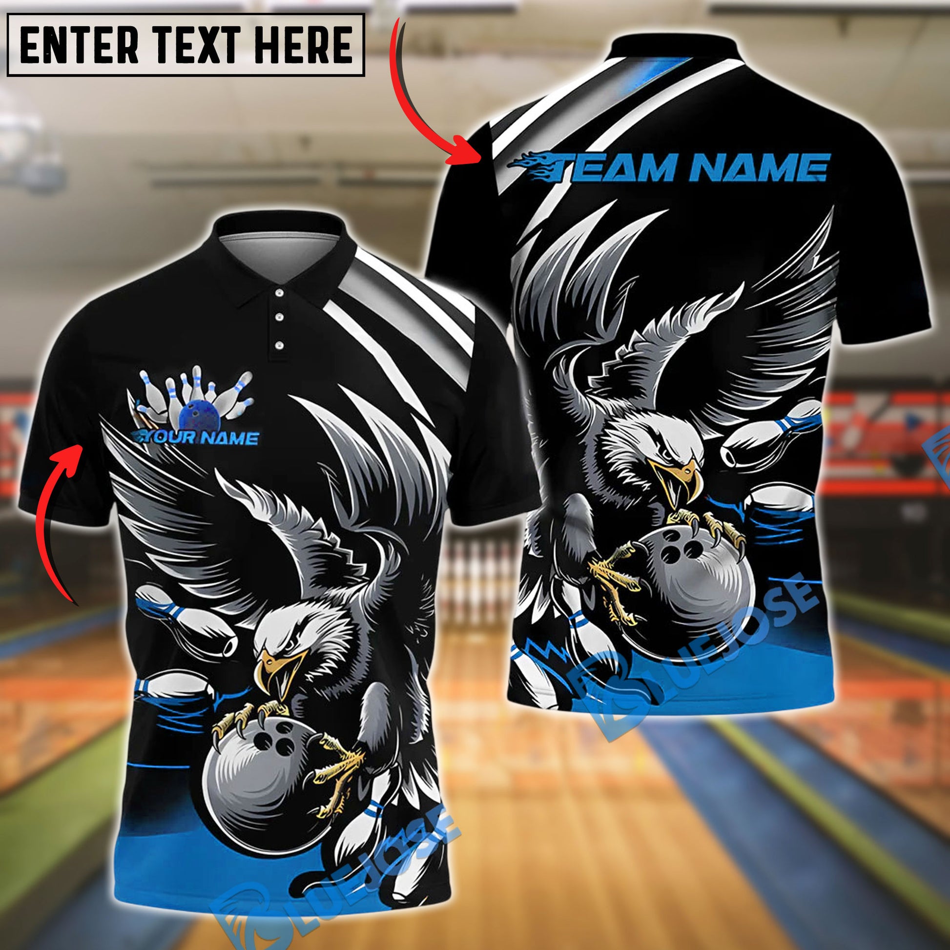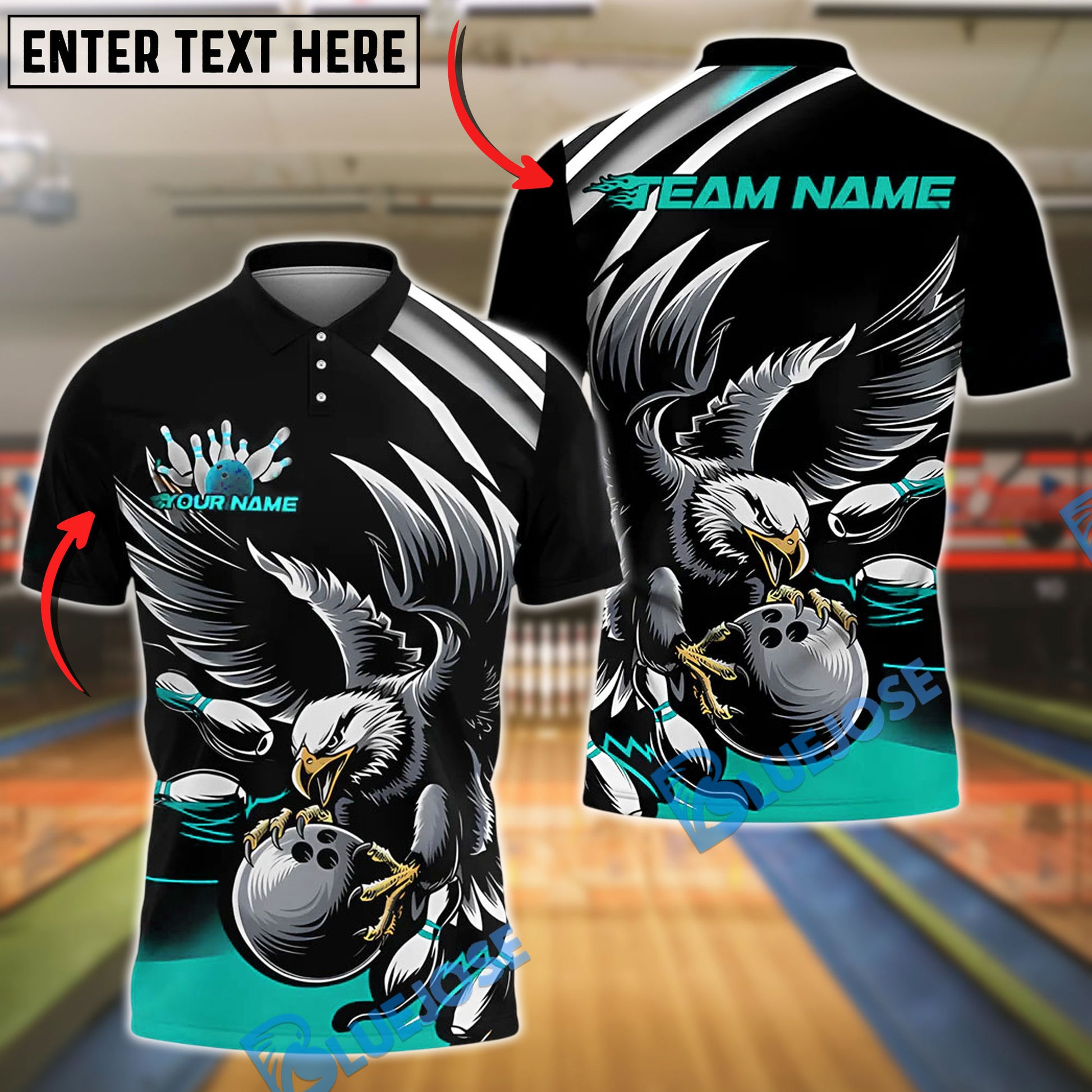 BlueJose Bowling And Pins Black Eagle Customized Name, Team Name 3D Shirt (4 Colors)