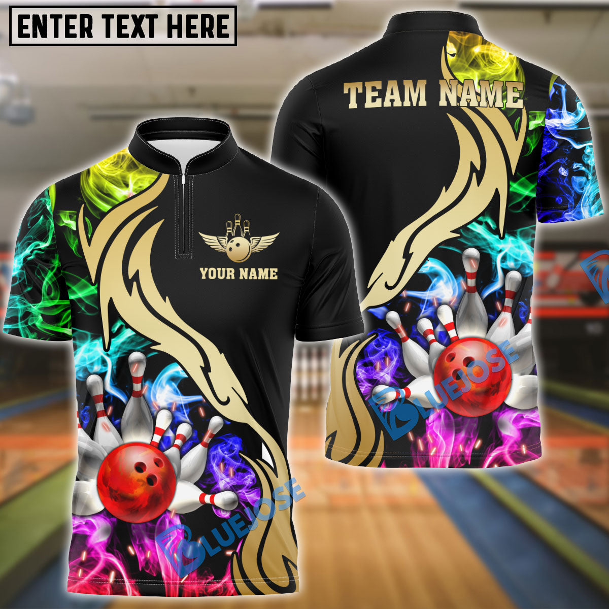 BlueJose Bowling And Pins Black Multicolor Golden Smoke Pattern Personalized Name, Team Name Unisex Shirt