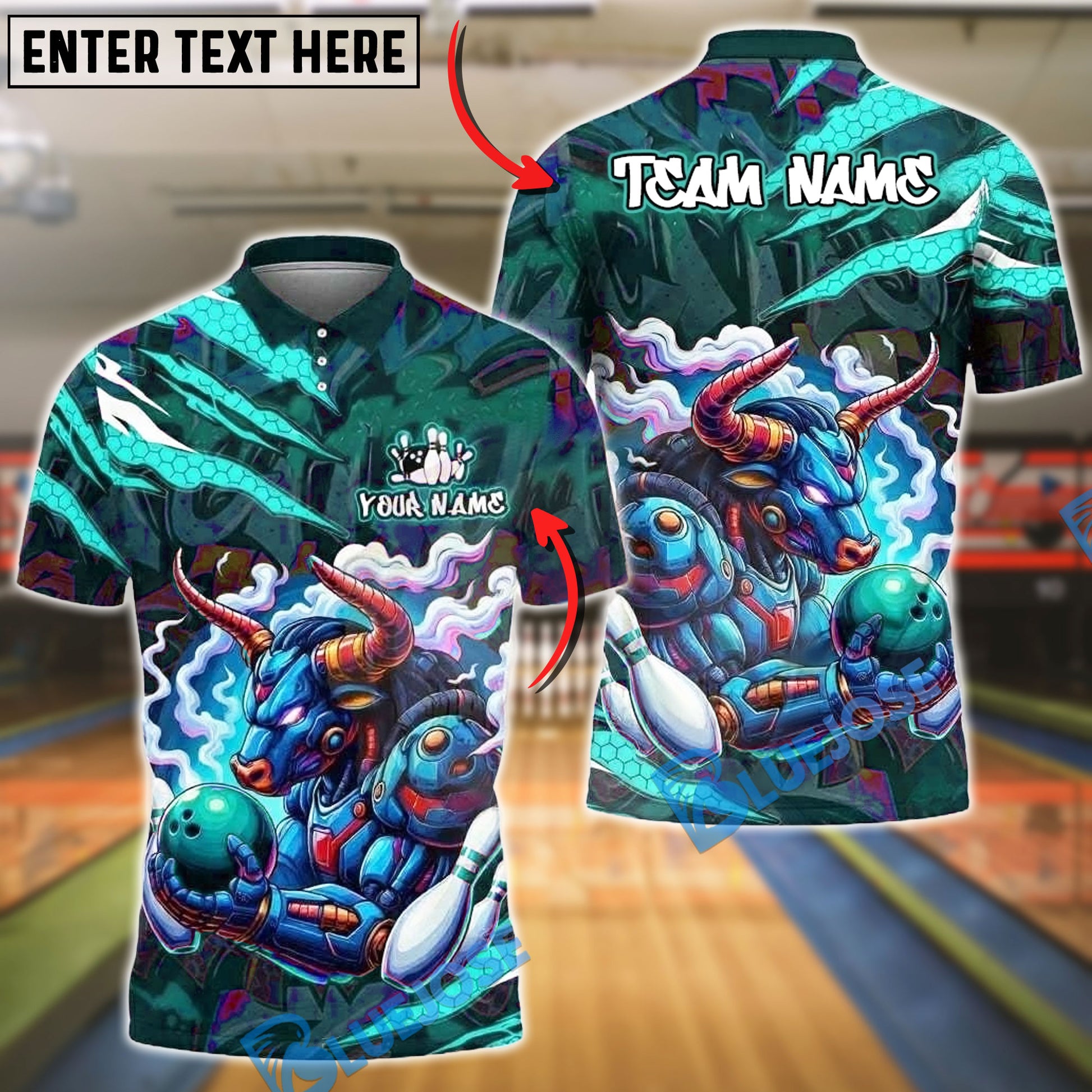 BlueJose Bowling And Pins Cyber Bull Neon Graffiti Customized Name, Team Name 3D Shirt (4 Colors)