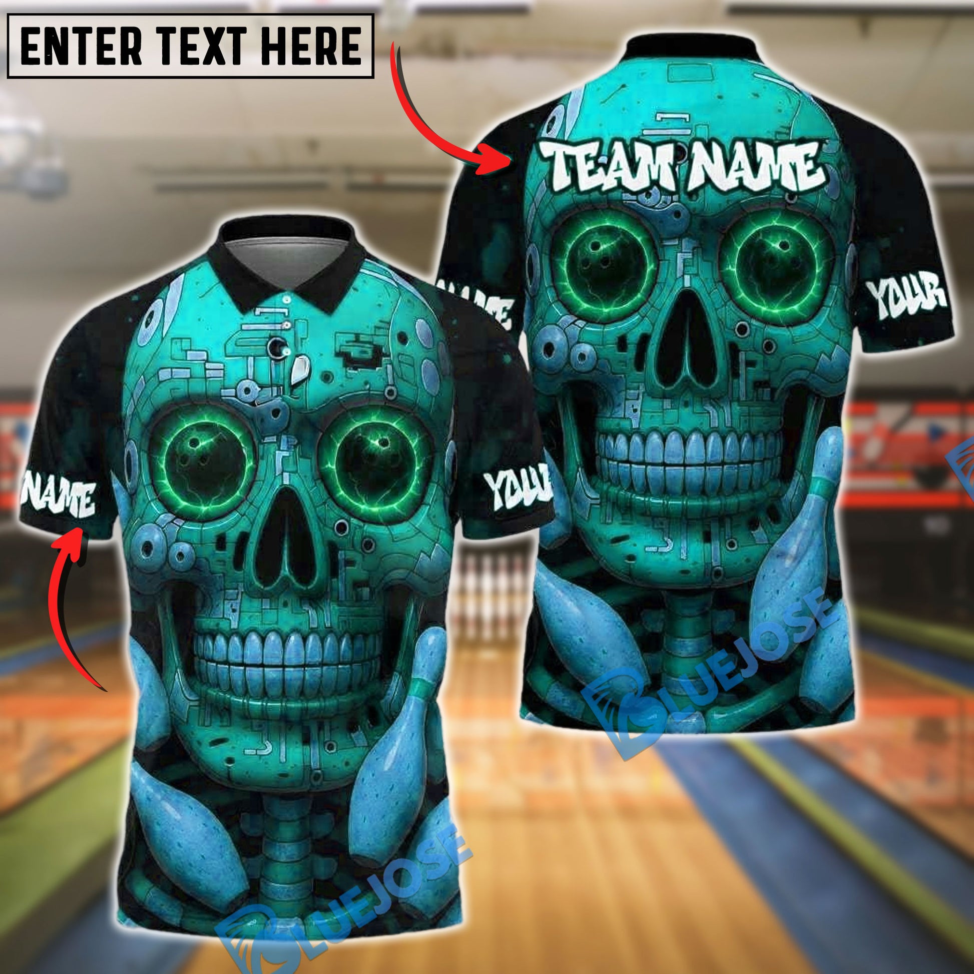 BlueJose Bowling And Pins Cyber Skull Tech Style Customized Name, Team Name 3D Shirt (4 Colors)