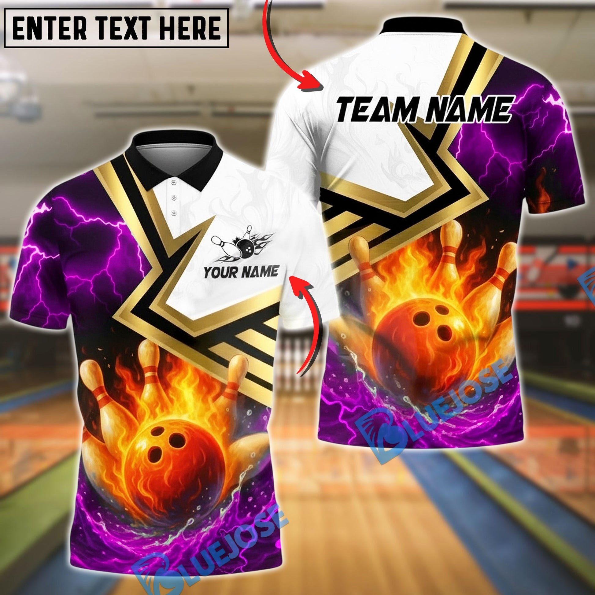 BlueJose Bowling And Pins Fire and Lightning Customized Name, Team Name 3D Shirt (4 Colors)