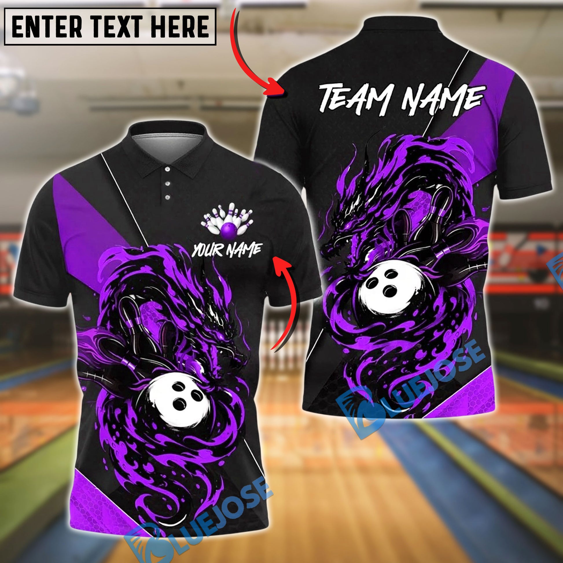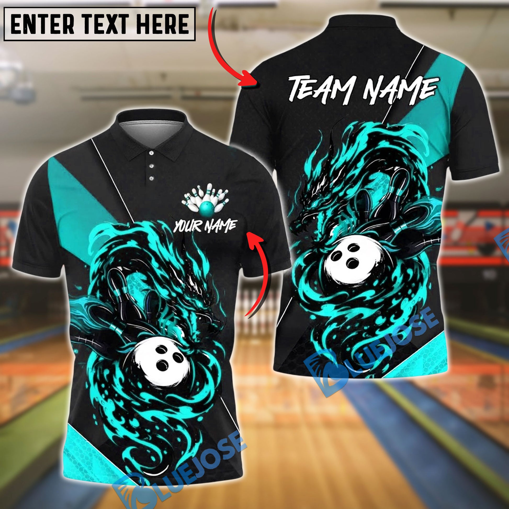 BlueJose Bowling And Pins Flame Dragon Strike Customized Name, Team Name 3D Shirt (4 Colors)