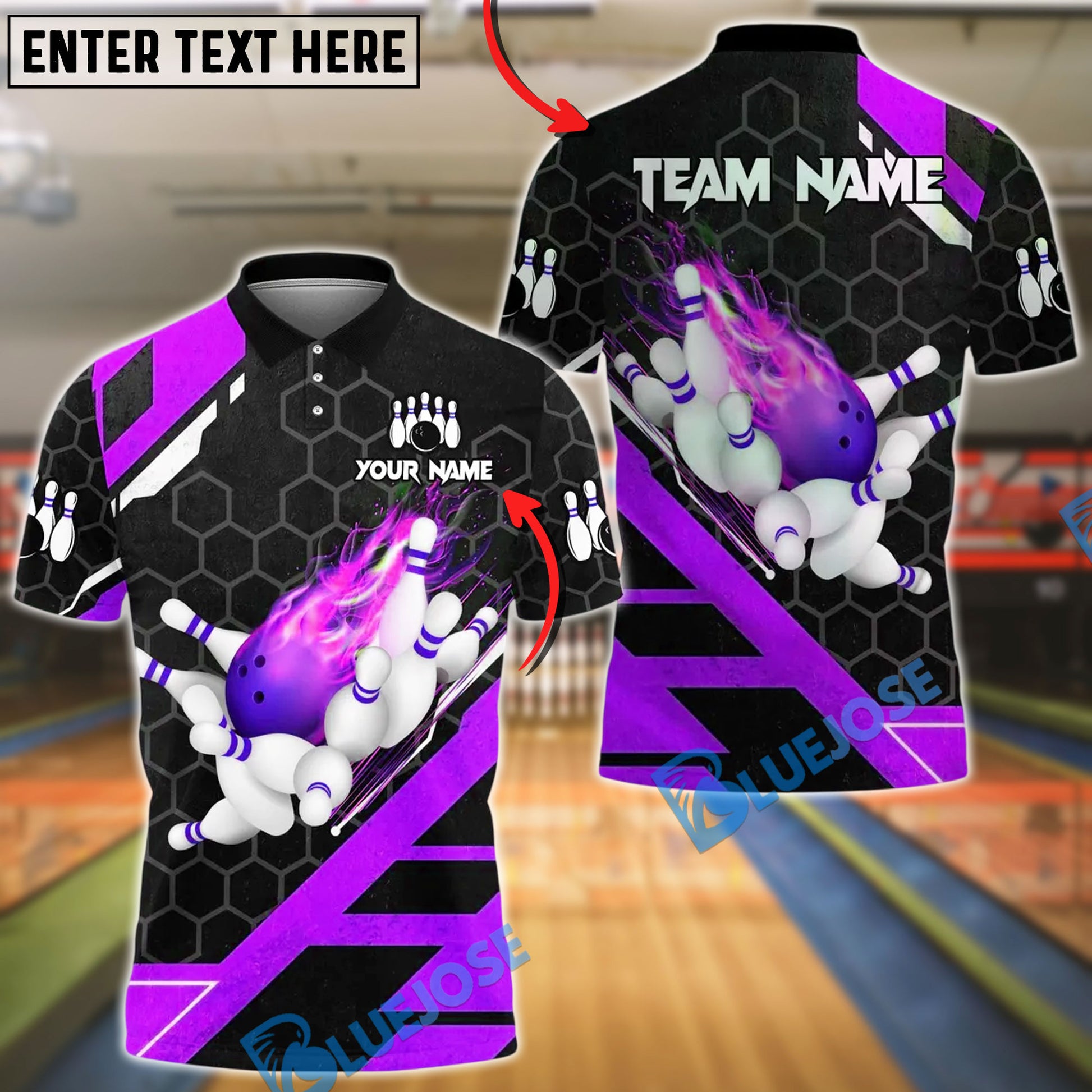 BlueJose Bowling And Pins Flame Hexagon Pattern Customized Name, Team Name 3D Shirt (4 Colors)