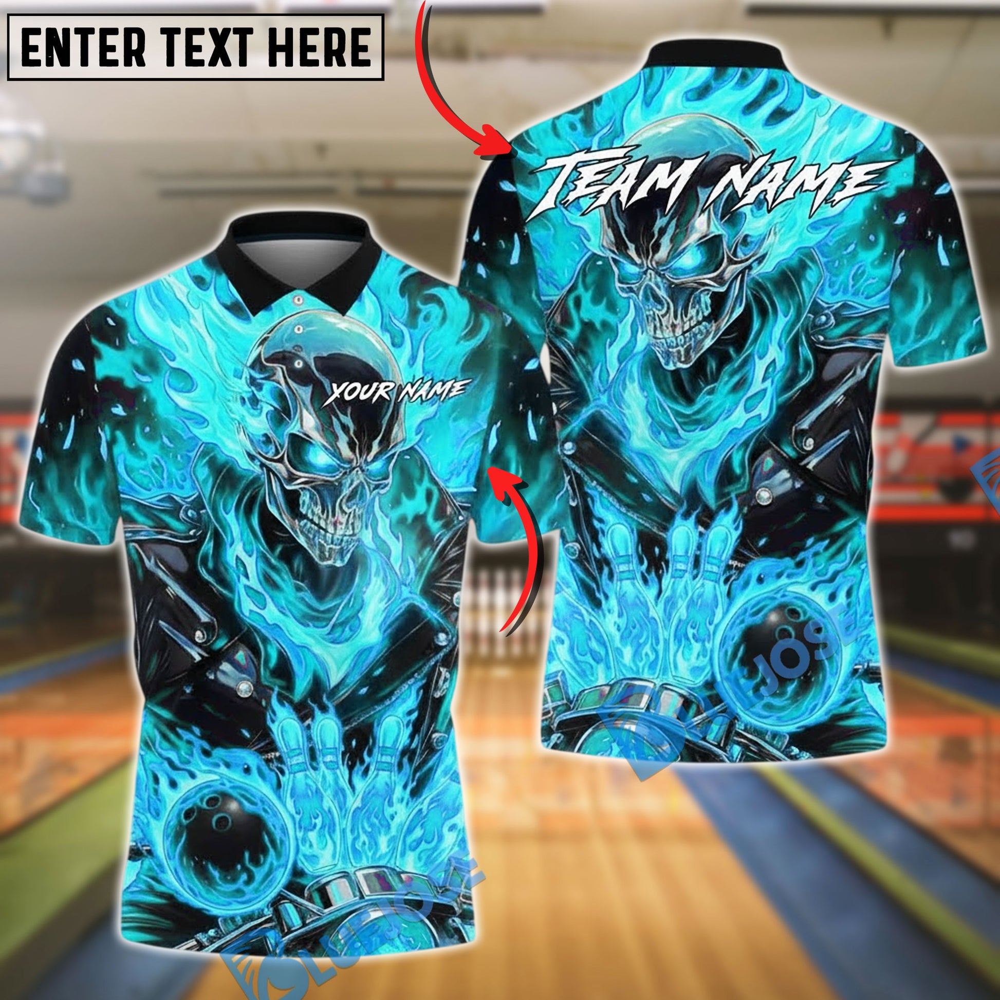 BlueJose Bowling And Pins Flaming Skull Strike Ball Fire Explosion 3D Design Customized Name, Team Name 3D Shirt (4 Colors)