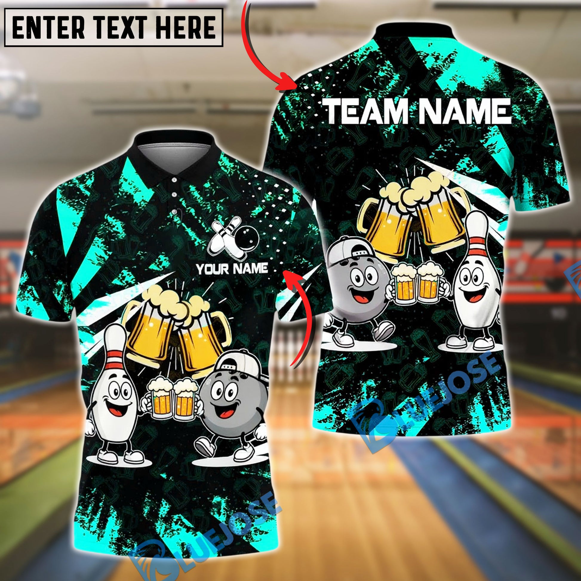 BlueJose Bowling And Pins Funny Beer & Bowling Pins Cartoon Design Customized Name, Team Name 3D Shirt (6 Colors)