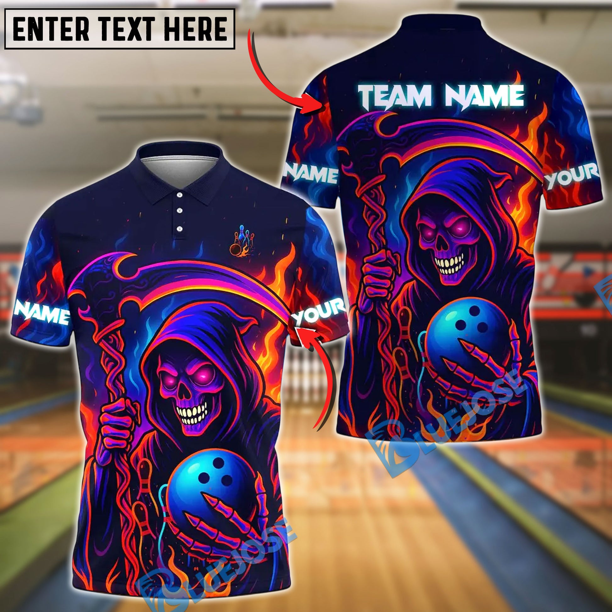 BlueJose Bowling And Pins Grim Reaper Neon Flame Design Customized Name, Team Name 3D Shirt