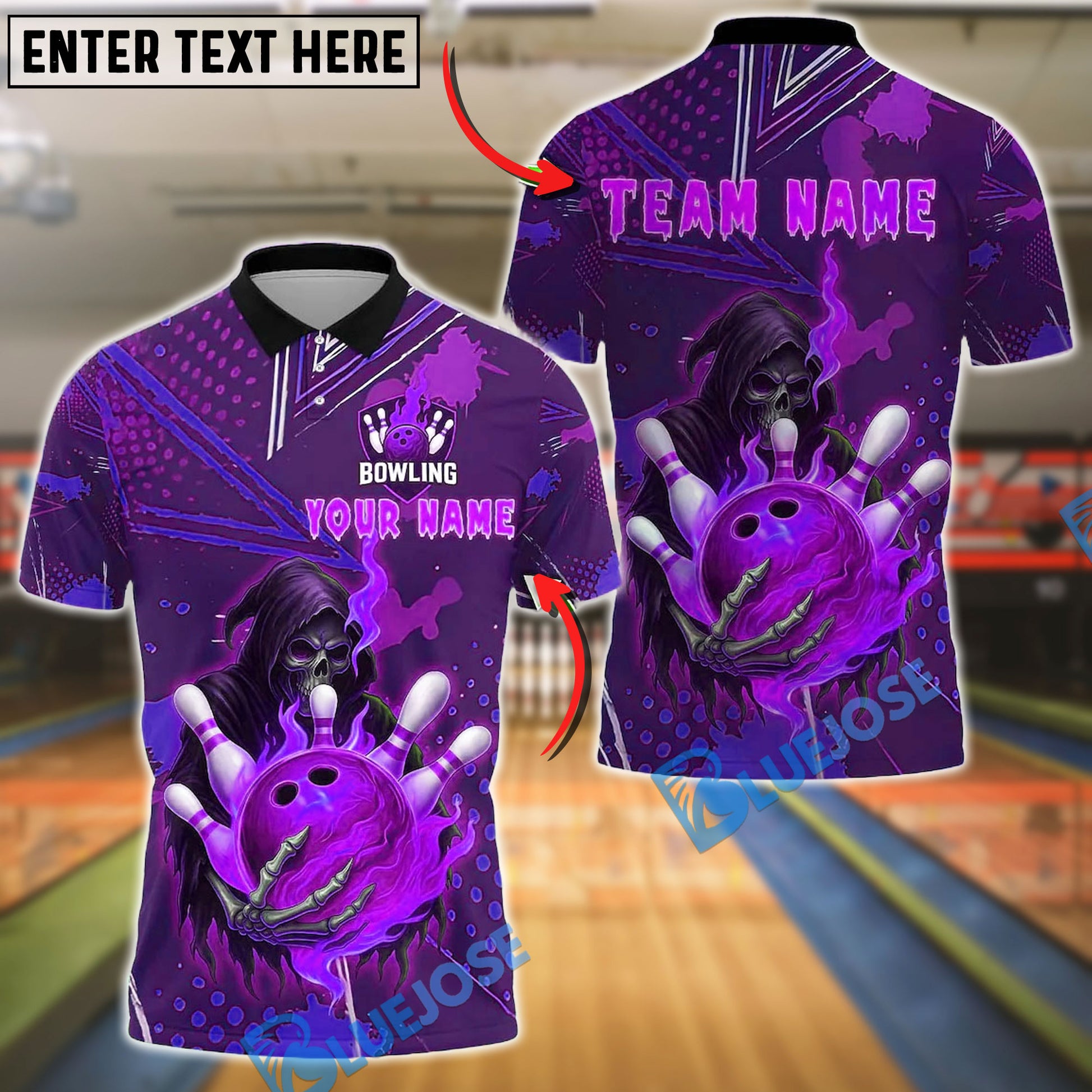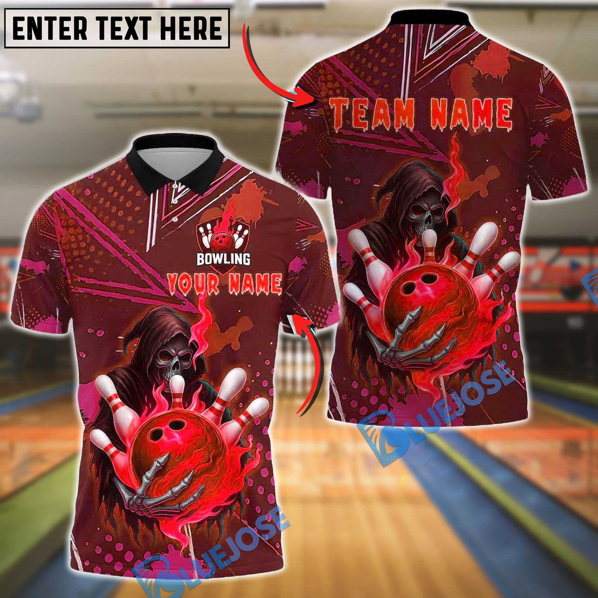 BlueJose Bowling And Pins Grim Reaper Skull Customized Name, Team Name 3D Shirt (4 Colors)