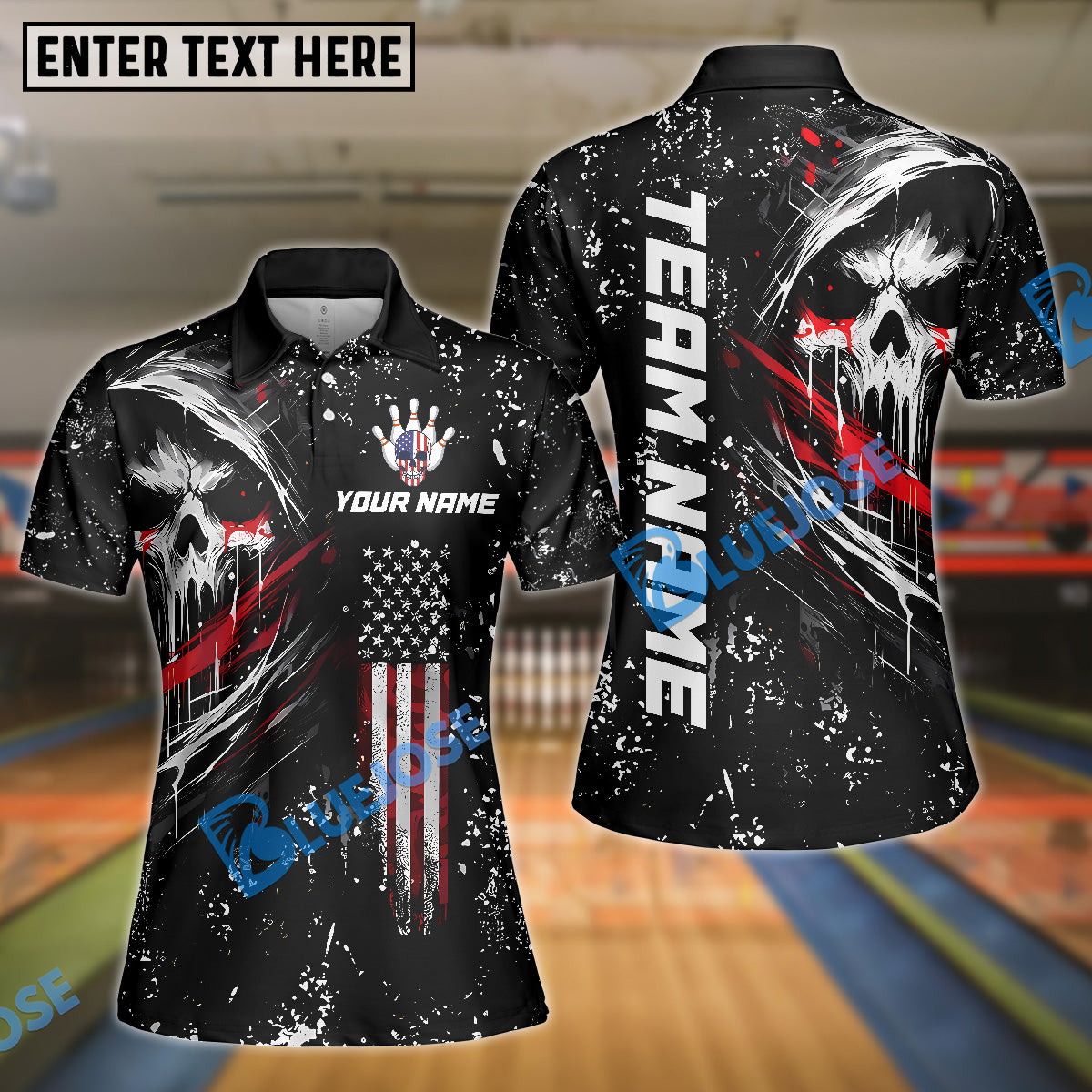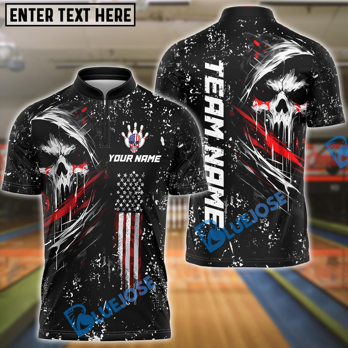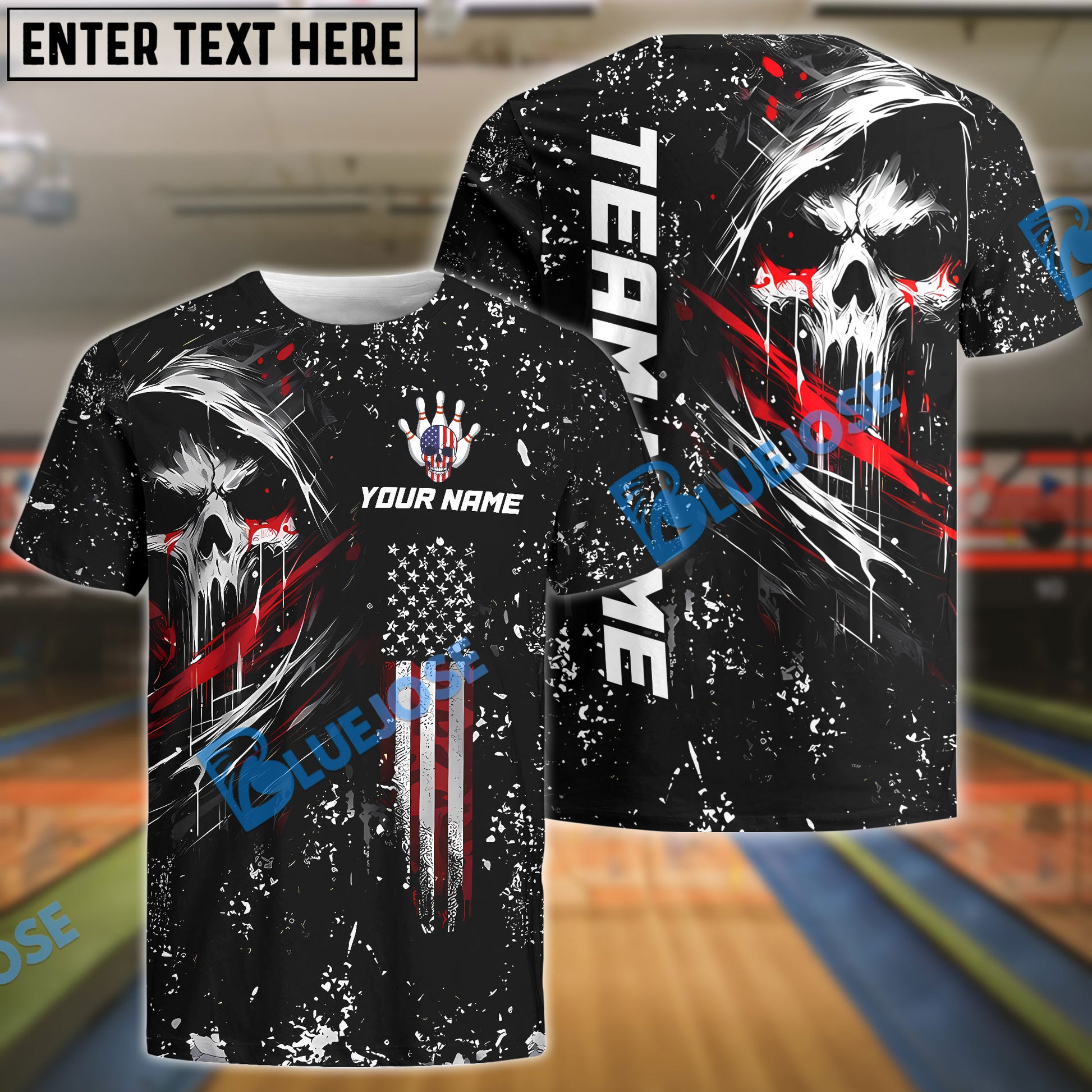BlueJose Bowling And Pins Grim Skull with American Flag Personalized Name, Team Name Shirt