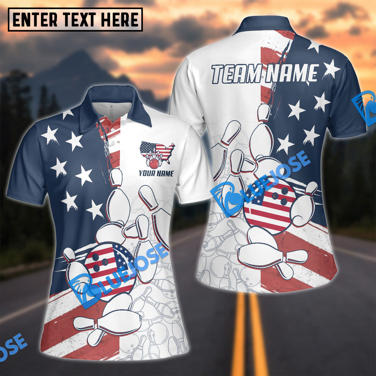 BlueJose Bowling And Pins Liberty Roll US Flag Personalized Name And Team Name 3D Shirt