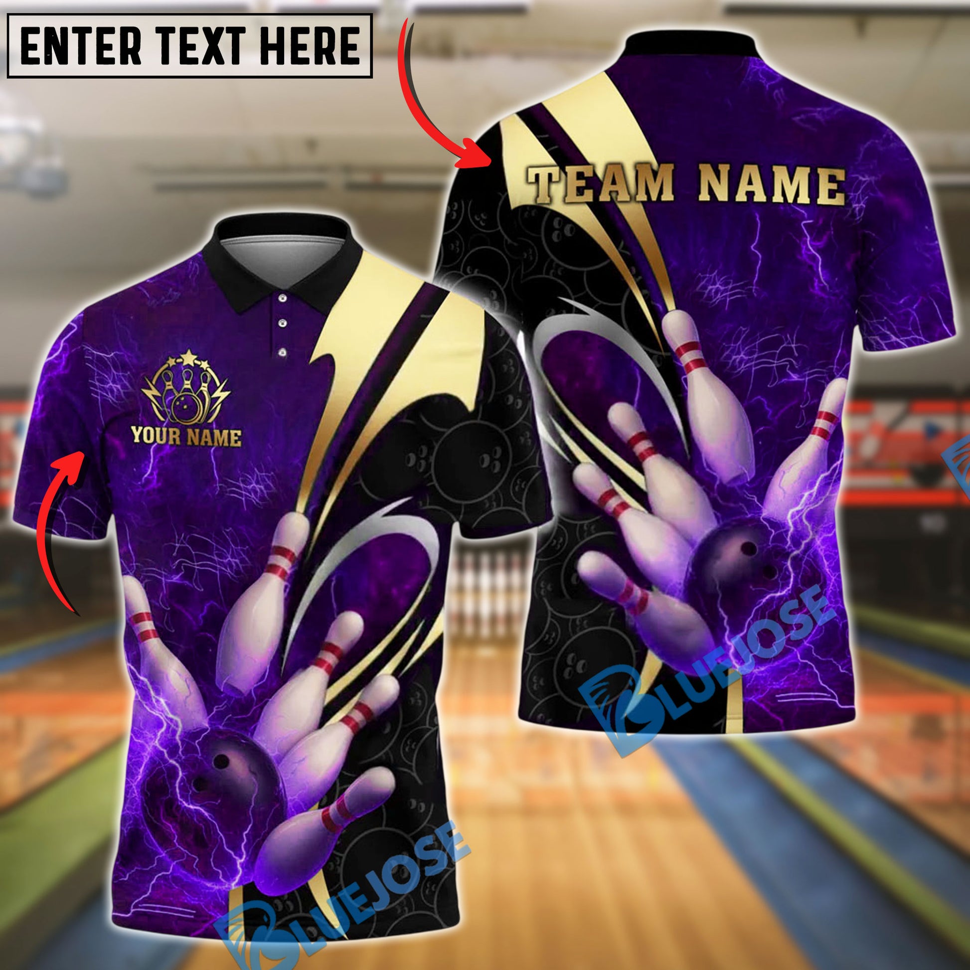 BlueJose Bowling And Pins Lightning Strike Design Customized Name, Team Name 3D Shirt (4 Colors)