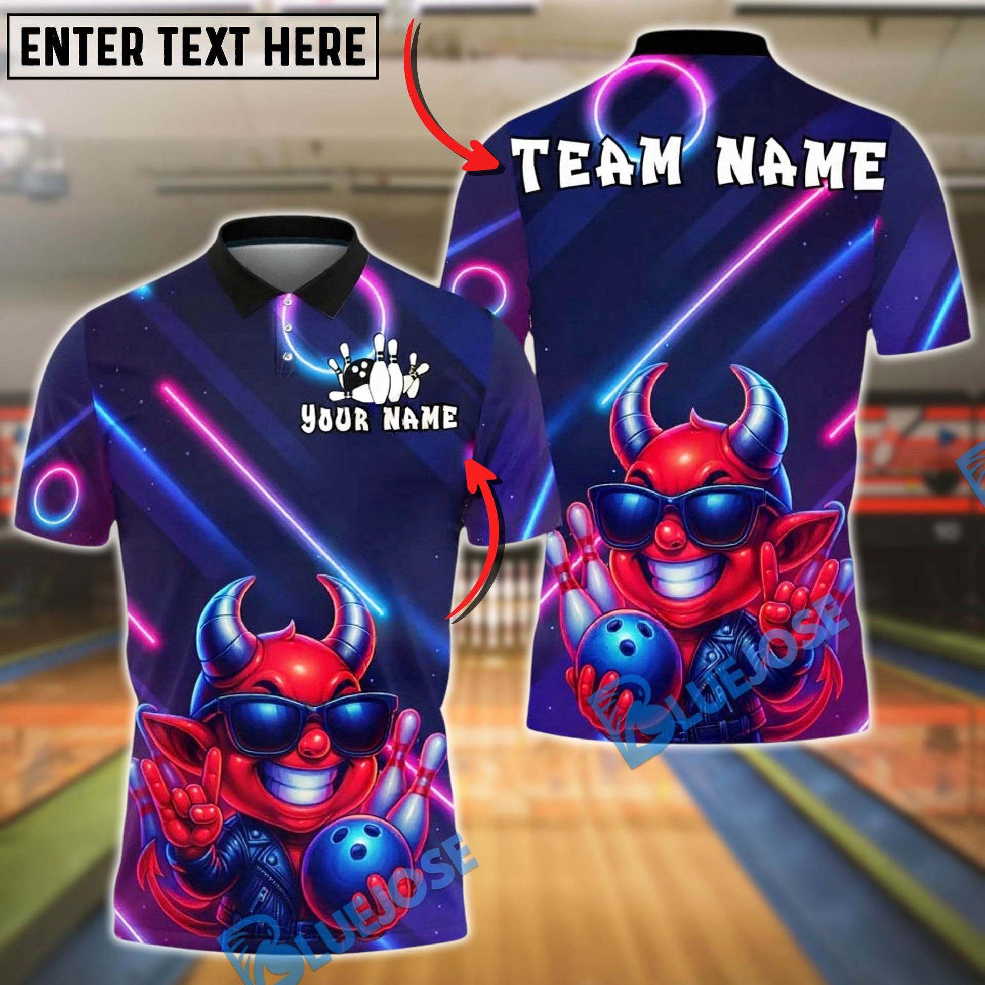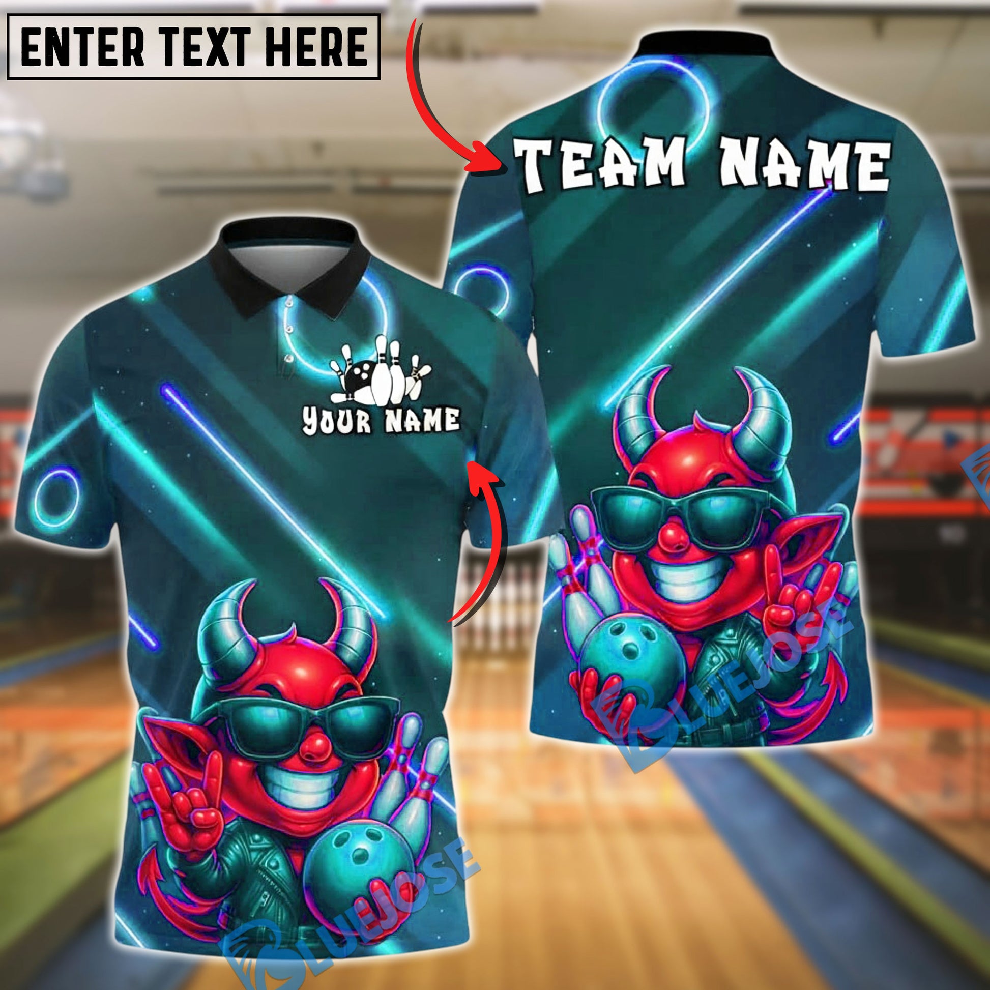 BlueJose Bowling And Pins Neon Devil Character Customized Name, Team Name 3D Shirt (4 Colors)