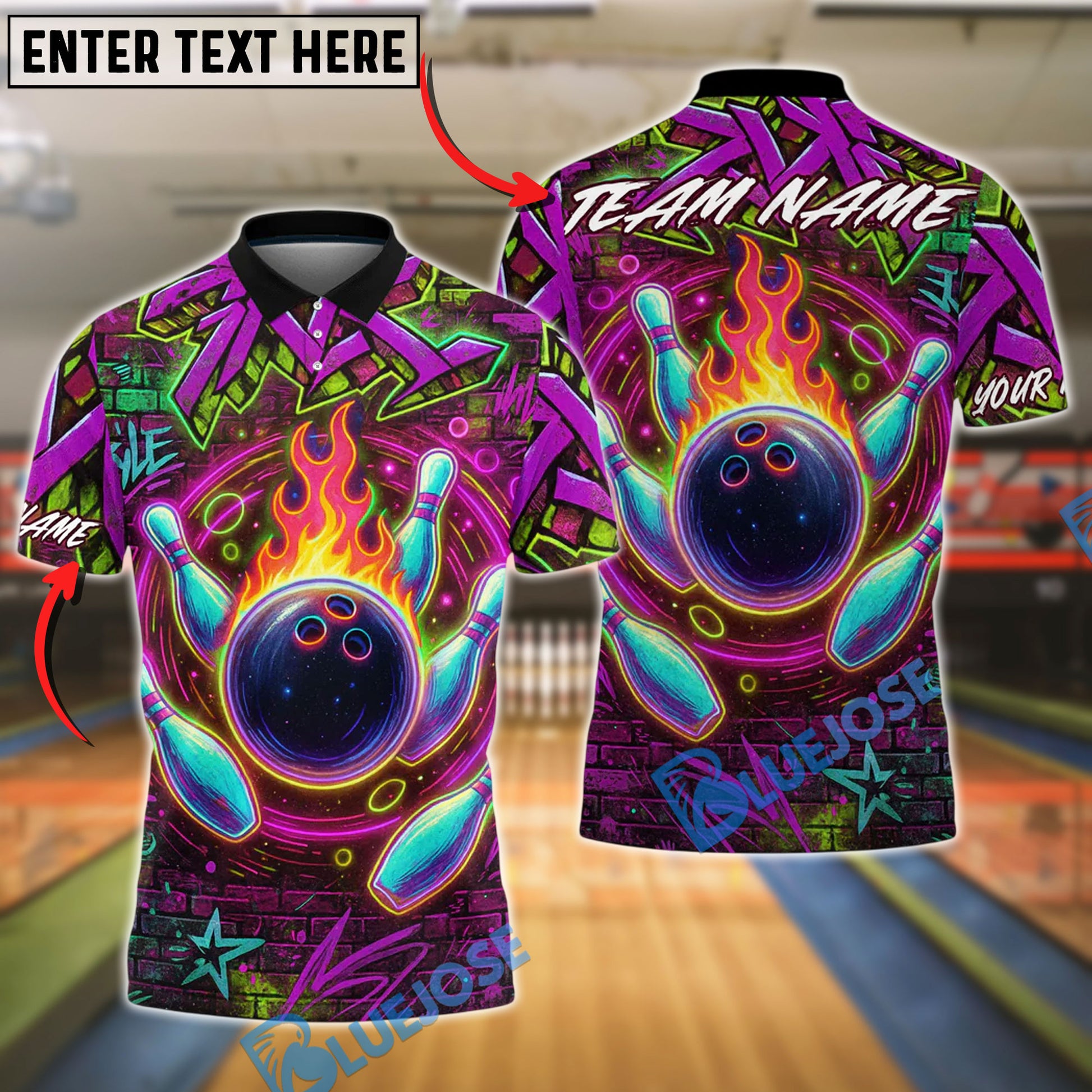 BlueJose Bowling And Pins Neon Graffiti Flame Customized Name, Team Name 3D Shirt (4 Colors)
