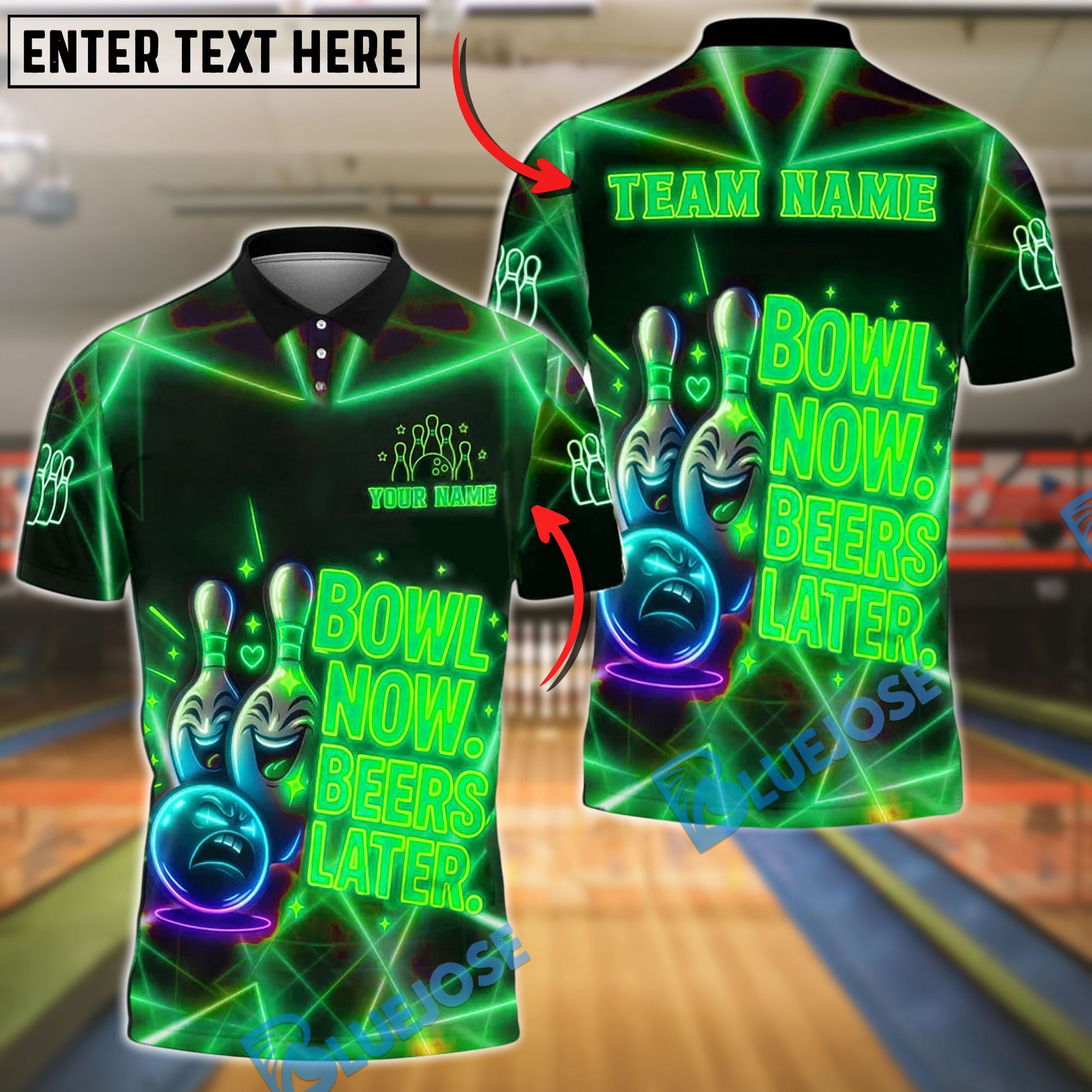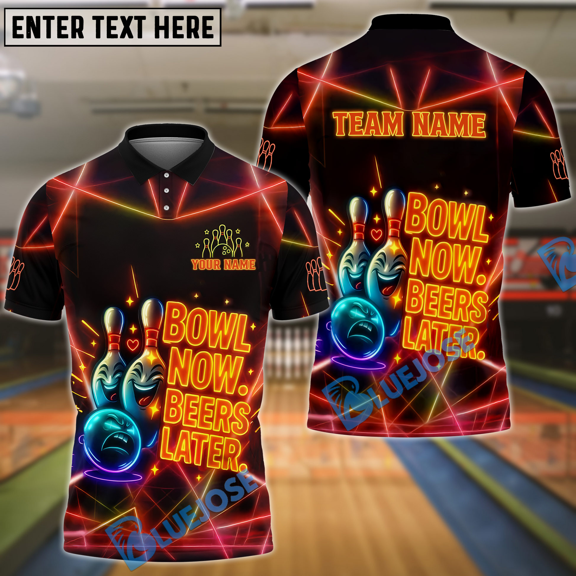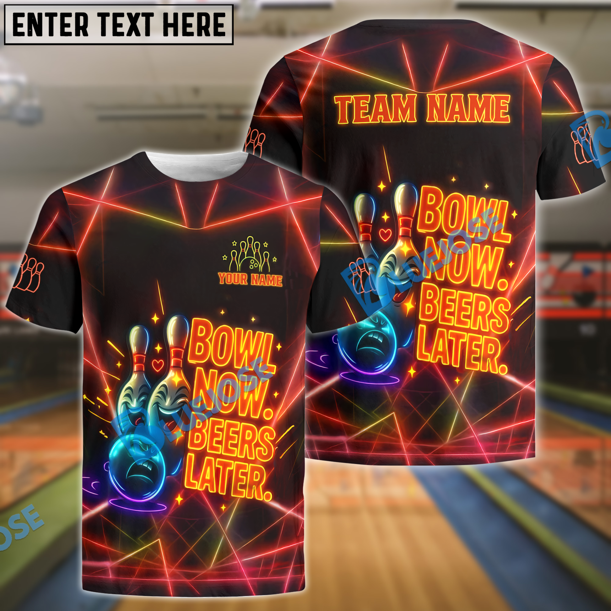BlueJose Bowling And Pins Neon Now Beers Later Funny Quote Customized Name 3D Shirt (4 Colors)