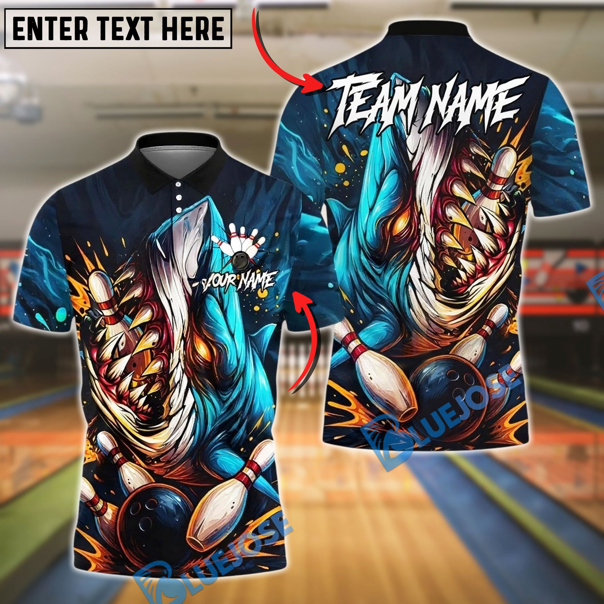 BlueJose Bowling And Pins Scary Fierce Shark Attack Customized Name, Team Name 3D Shirt (4 Colors)