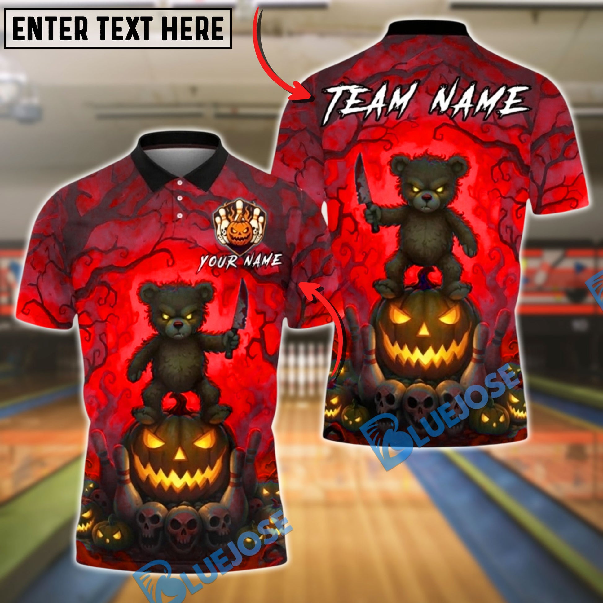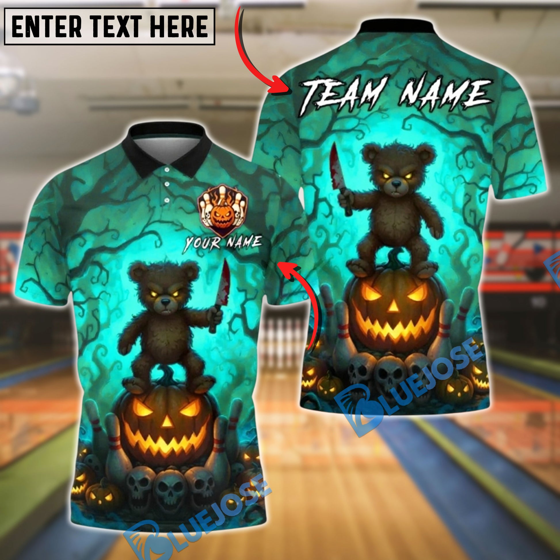 BlueJose Bowling And Pins Scary Teddy Bear Knife Pumpkin Ball Creepy Forest Halloween Customized Name, Team Name 3D Shirt (4 Colors)